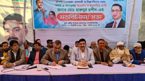 মাহিদুল ইসলাম ফরহাদ চাঁপাইনবাবগঞ্জ জেলা প্রতিনিধি: চাঁপাইনবাবগঞ্জের ব্যবসায়ী ও শিল্পপতিদের সঙ্গে সদর-৩ আসনের বিএনপির মনোনীত প্রার্থী মোঃ হারুনুর রশীদের মতবিনিময় সভা অনুষ্ঠিত হয়েছে। শনিবার (১০ জানুয়ারি) সকাল সাড়ে ১১টায় শহরের পাঠানপাড়া…