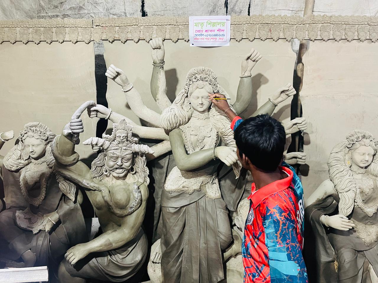 অন্য এক শিল্পী প্রকাশ ঘোষ অবুঝ বলেন, “দুটি কারখানা ও বাড়িতে মোট ১০টি প্রতিমা তৈরি করছি আমরা পাঁচজন মিলে। দাম পড়বে ২৫ হাজার থেকে ৬০ হাজার টাকা। মাটির কাজ শেষ, মঙ্গলবার থেকে রঙের কাজ শুরু হবে।”