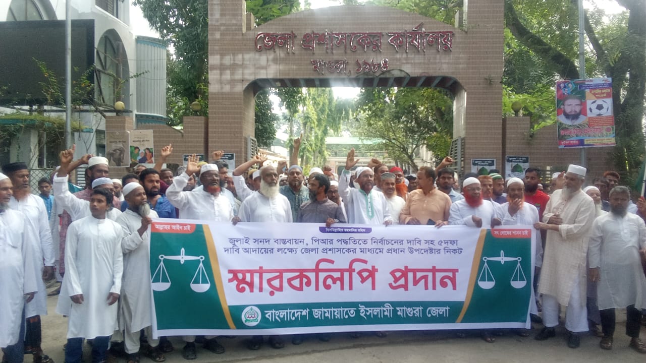 মোঃ সাইফুল্লাহ, মাগুরা সংবাদদাতা: মাগুরায় জামায়াতে ইসলামীর কেন্দ্র ঘোষিত কর্মসূচীর অংশ হিসেবে জুলাই সনদ বাস্তবায়ন, পিয়ার পদ্ধতিতে নির্বাচনের দাবীসহ ৫ দফা দাবী আদায়ের লক্ষ্যে রবিবার ১২ (অক্টোবর) সকালে জেলা প্রশাসকের মাধ্যমে প্রধান উপদেষ্টার নিকট স্মারক লিপি প্রদান করেছে জেলা জামায়াতে ইসলামী।