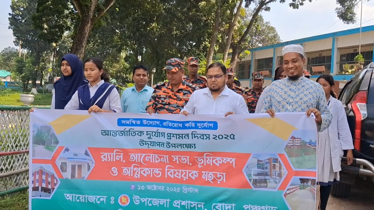 বোদা (পঞ্চগড়) প্রতিনিধি : “ সমন্বিত উদ্যোগ, প্রতিরোধ করি দুর্যোগ ” প্রতিপাদ্য বিষয় নিয়ে পঞ্চগড়ের বোদায় র্যালি, আলোচনা সভা ভূমিকম্প ও অগ্নিকান্ডে করণীয় বিষয়ক মহড়ার মধ্য দিয়ে আন্তর্জাতিক দুর্যোগ প্রশমন দিবস-২০২৫ উদযাপন করা হয়েছে। এ উপলক্ষে উপজেলা প্রশাসন ও দুর্যোগ ব্যবস্থাপনা বিভাগের আয়োজনে সোমবার ( ১৩ অক্টোবর) দুপুরে উপজেলা পরিষদ চত্বর থেকে একটি র্যালি বের করা হয়। র্যালি শেষে উপজেলা পরিষদ চত্বরে আলোচনা ও ফায়ার সার্ভিসের মহড়া অনুষ্ঠিত হয়। অনুষ্ঠানে উপজেলা নির্বাহী অফিসার রবিউল ইসলাম এর সভাপতিত্বে প্রতিপাদ্য বিষয়ের উপর গুরুত্বারোপ করে বক্তব্য রাখেন অফিসার ইনচার্জ (ওসি) আজিম উদ্দিন, উপজেলা প্রকল্প বাস্তবায়ণ কর্মকর্তা ওয়ালিফ মন্ডল,বোদা ফায়ার সার্ভিস ও সিভিল ডিফেন্স স্টেশনের কর্মকর্তা মোঃ রায়হান প্রমুখ। বক্তারা বলেন, দুর্যোগ দুই প্রকার- মানবসৃষ্ট ও প্রাকৃতিকসৃষ্ট। প্রাকৃতিক দুর্যোগ মোকাবিলায় সবাইকে সম্মিলিতভাবে এগিয়ে আসতে হবে। তাছাড়া মানবসৃষ্ট দুর্যোগ নিরসনে সবাইকে সচেতন হতে হবে। দুর্যোগ বিষয়ে সময়োপযোগী ব্যবস্থা গ্রহণ করতে হবে। সর্বোপরি বৈশ্বিক জলবায়ু পরিবর্তন মোকাবেলায় সবাইকে সচেতন থাকতে হবে। সভাপতির বক্তব্যে উপজেলা নির্বাহী অফিসার রবিউল ইসলাম বলেন, দুর্যোগ মোকাবিলায় কেবল সরকার নয়, প্রতিটি নাগরিকের সচেতনতা ও অংশগ্রহণ অপরিহার্য। পরিবার ও সমাজস্তরে দুর্যোগ প্রস্তুতি এবং সময় মতো সঠিক পদক্ষেপই পারে প্রাণহানি ও ক্ষয়ক্ষতি অনেকটা কমিয়ে আনতে। তাই আজকের দুর্যোগ প্রশমন দিবস হোক ব্যক্তি, সমাজ ও রাষ্ট্রের সমন্বিত সচেতনতার নতুন অঙ্গিকার। আলোচনা শেষে উপজেলা পরিষদ চত্বরে ফায়ার সার্ভিস এন্ড সিভিল ডিফেন্স এর কর্মকর্তা মোঃ রায়হান নেতৃত্বে ফায়ার সার্ভিস কর্মীদের একটি চৌকশদল সকলকে সচেতনতার লক্ষ্যে অগ্নিকান্ড সহ বিভিন্ন দুর্যোগ প্রশমনে করণীয় কৌশল সম্পর্কিত মহড়া প্রদর্শন করেন। অনুষ্ঠানে বিভিন্ন দপ্তরের কর্মকর্তা-কর্মচারী, ফায়ার সার্ভিস এন্ড সিভিল ডিফেন্স, পুলিশ,আনসার, শিক্ষক-শিক্ষার্থীসহ গণমাধ্যমকর্মীগণ উপস্থিত ছিলেন।