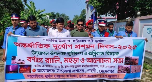 গাংনীতে আন্তর্জাতিক দুর্যোগ প্রশমন দিবস-২০২৫ উপলক্ষ্যে র‌্যালি মহড়া ও আলোচনা সভা