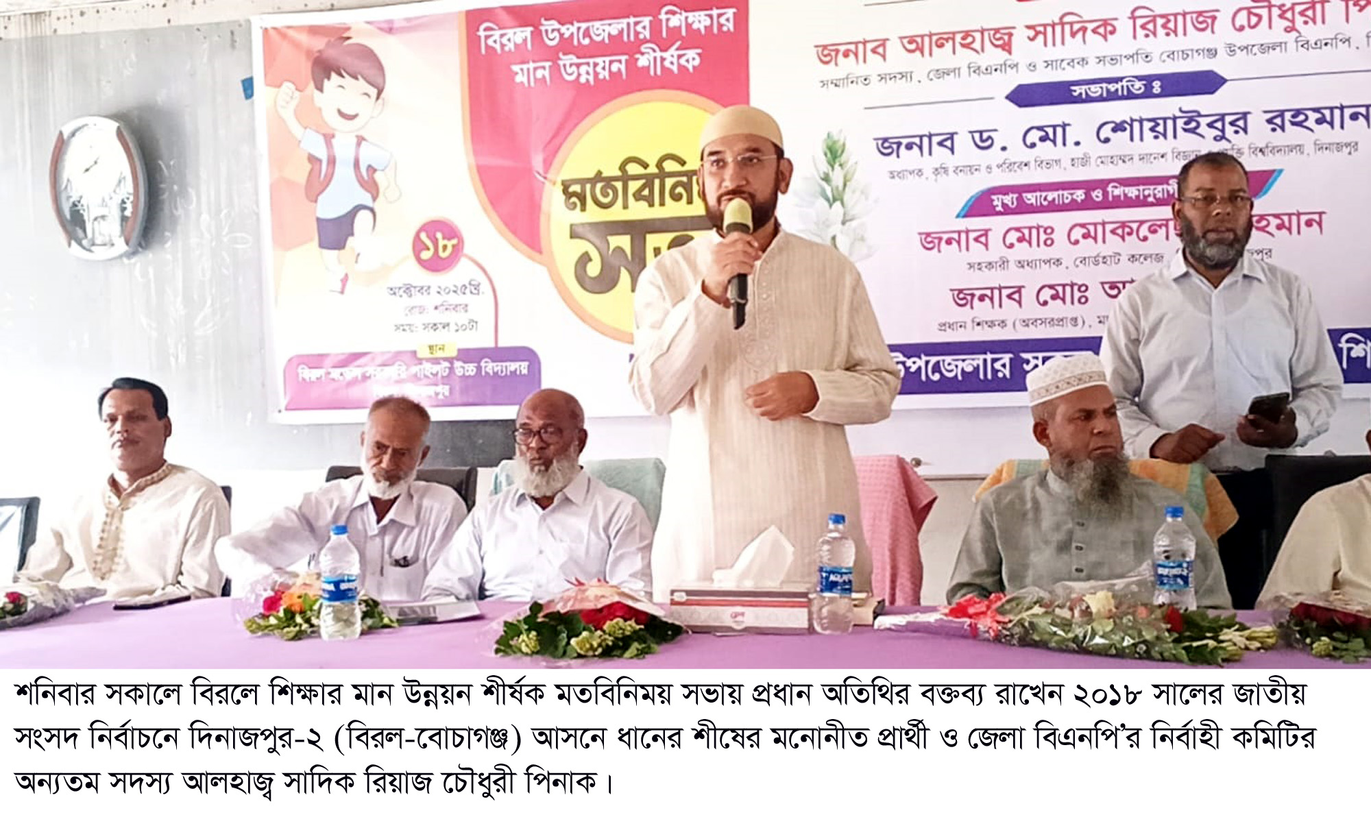 শনিবার সকালে বিরল উপজেলার সকল শিক্ষা প্রতিষ্ঠানের শিক্ষকবৃন্দের আয়োজনে বিরল সরকারি পাইলট মডেল উচ্চ বিদ্যালয় হল রুমে শিক্ষার মান উন্নয়ন শীর্ষক মতবিনিময় সভায় প্রধান অতিথি হিসেবে বক্তব্য রাখেন আসন্ন জাতীয় সংসদ নির্বাচনে দিনাজপুর-২ (বিরল-বোচাগঞ্জ) আসনে ধানের শীষের মনোনয়ন প্রার্থী ও জেলা বিএনপি’র নির্বাহী কমিটির অন্যতম সদস্য আলহাজ্ব সাদিক রিয়াজ চৌধুরী পিনাক।