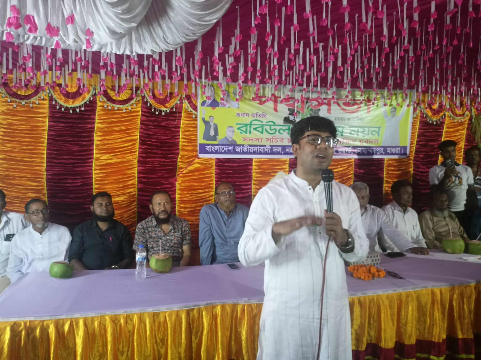 বিশ্বজিৎ সিংহ রায় মাগুরা প্রতিনিধিঃ মাগুরার মহম্মদপুর উপজেলার নহাটা ইউনিয়নের নবনগর নাট মন্দির প্রাঙ্গণে মঙ্গলবার ২১ অক্টোবর বিকেলে এক পথসভা অনুষ্ঠিত হয়।পথসভায় প্রধান অতিথি হিসেবে উপস্থিত ছিলেন ঢাকা মহানগর দক্ষিণ যুবদলের সদস্য সচিব ও মাগুরা-২ আসনের সংসদ সদস্য পদপ্রার্থী রবিউল ইসলাম নয়ন।