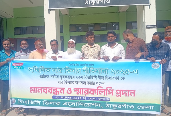 মঙ্গলবার (২৮ অক্টোবর) সকালে জেলা প্রশাসক কালেক্টরেট চত্বরে ঘন্টাব্যাপী এ মানববন্ধনের আয়োজন করে বিএডিসি ডিলারস অ্যাসোসিয়েশন, ঠাকুরগাঁও জেলা শাখা।