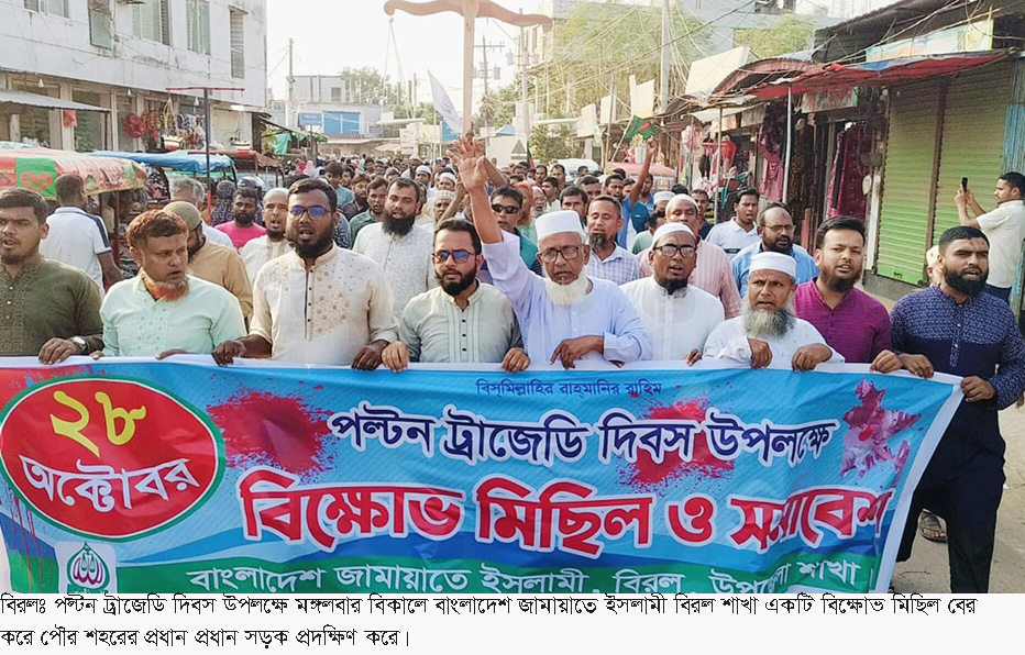 এম, এ কুদ্দুস, বিরল (দিনাজপুর) প্রতিনিধি : দিনাজপুরের বিরলে পল্টন ট্রাজেডি দিবস উপলক্ষে মঙ্গলবার বিকালে বিক্ষোভ মিছিল ও সমাবেশ করেছে বাংলাদেশ জামায়াতে ইসলামী বিরল শাখা।
