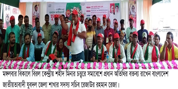 মঙ্গলবার বিকালে বিরল কেন্দ্রীয় শহীদ মিনার চত্বরে সমাবেশে প্রধান অতিথির বক্তব্য রাখেন বাংলাদেশ জাতীয়তাবাদী যুবদল জেলা শাখার সদস্য সচিব রেজাউর রহমান রেজা।