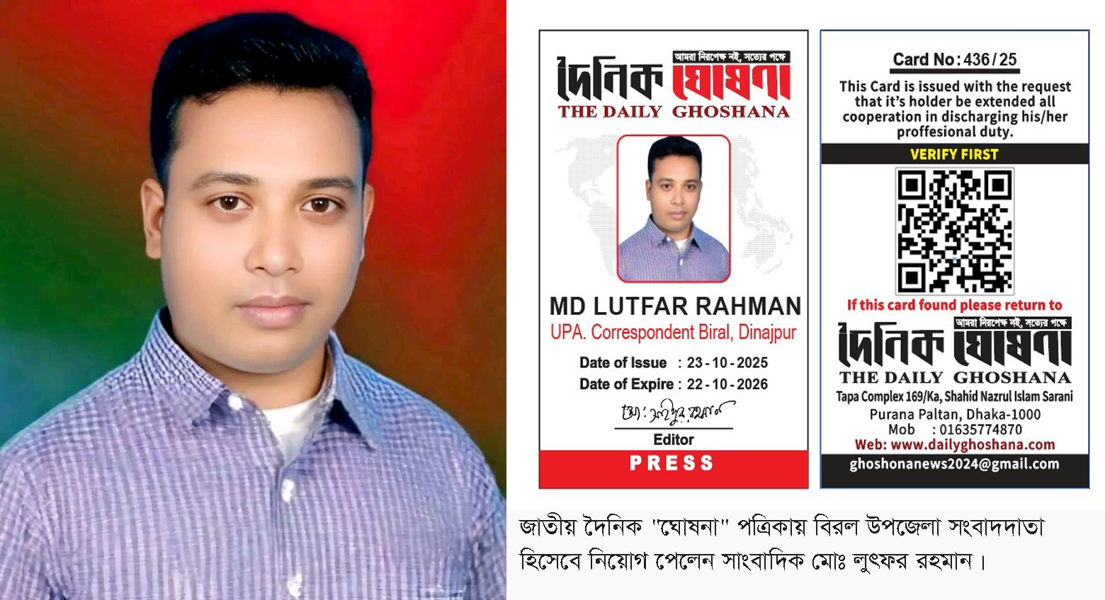 মঙ্গলবার তিনি ঢাকা থেকে প্রকাশিত সাহিদুল ইসলাম টেপা সম্পাদিত, দীর্ঘ ৩২ বছর ধরে প্রকাশিত জাতীয় দৈনিক ঘোষনা” পত্রিকার বিরল উপজেলা সংবাদ দাতা হিসেবে দায়িত্ব গ্রহণ করেছেন।