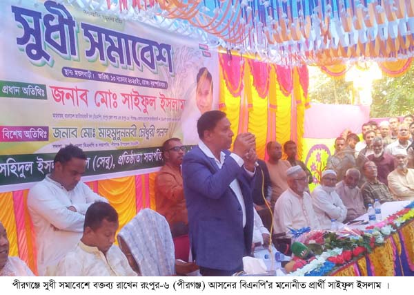 মোঃ আকতারুজ্জামান রানা পীরগঞ্জ(রংপুর)প্রতিনিধিঃ রংপুরের পীরগঞ্জ উপজেলা সদরের খিয়ারপাড়া মন্ডল বাড়ীতে আজ বিকেলে বিএনপির আহ্বানে এক সুধী সমাবেশ অনুষ্ঠিত হয়। পীরগঞ্জ পৌর বিএনপি’র প্রতিষ্ঠাতা সভাপতি শহিদুল ইসলাম সেবু মন্ডলের সভাপতিত্বে অনুষ্ঠিত সভায় বক্তব্য রাখেন রংপুর জেলা বিএনপি’র আহবায়ক ও ২৪ রংপুর– পীরগঞ্জ ৬ আসনের বিএনপি দলীয় মনোনীত সংসদ সদস্য পদপ্রার্থী সাইফুল ইসলাম। অন্যান্যেও মধ্যে বক্তব্য রাখেন পীরগঞ্জ উপজেলা বিএনপি’র সভাপতি মাহমুদুন্নবী চৌধুরী পলাশ,সাধারন সম্পাদক সহকারী অধ্যাপক জাকির হোসেন,সাংগাঠনিক সম্পাদক শাহিনুজ্জামান শাহিন,আতোয়ার রহমান (বিটু) জামতলা হাফেজিয়া মাদ্রাসার মোহতামিম মাওলানা রেজাউল করিম, প্রবীন ব্যাক্তি নুরুল ইসলাম,শিক্ষক রফিকুল ইসলাম,অধ্যক্ষ পেয়ারা হোসেন,রংপুর স্বেচ্ছাসেবক দলের যুগ্ম আহ্বায়ক জুনায়েদ আহমেদ, পীরগঞ্জ পৌর বিএনপি’র সাধারন সম্পাদক ইয়াতিমুল হাসান লিটন, সাংগাঠনিক সম্পাদক আব্দুল করিম সরকার ও জেলা কৃষক দলের সভাপতি আনোয়ার সাহাদত প্রমুখ। সভায় সাইফুল ইসলাম তার বক্তব্যে বলেন-একটা বৈষম্যহীন ও দুর্নীতি মুক্ত পীরগঞ্জ গড়তে আগামী নির্বাচনে ধানের শীষ প্রতীকে ভোট দেয়ার আহবান জানিয়ে বলেন, আগামীতে আমরা রংপুরের মানুষের উন্নয়ন ও কর্মসংস্থান সৃষ্টির লক্ষ্যে কাজ করতে চাই। আর এ জন্য পীরগঞ্জ ও রংপুর বাসীর সহযোগীতা দরকার।