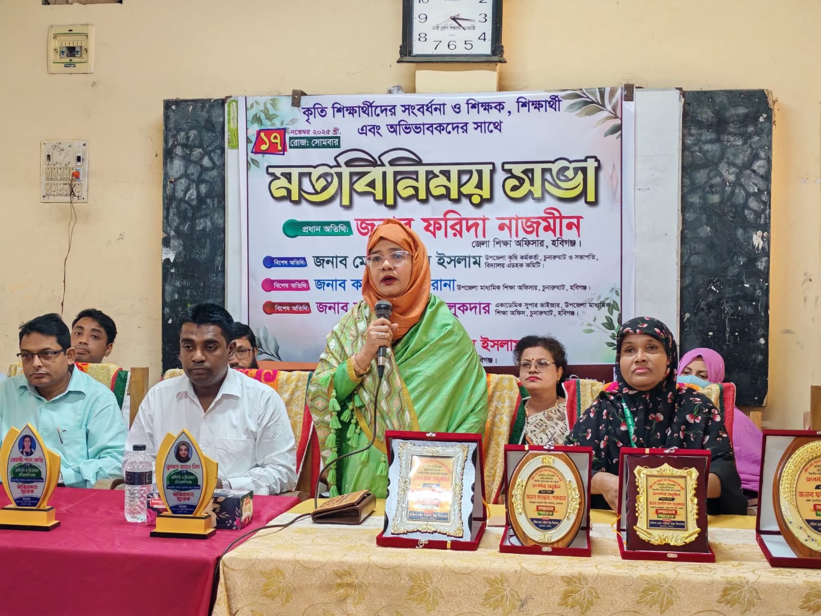 মো: আসাদুজ্জামান খাঁন : (চুনারুঘাট প্রতিনিধি)হবিগঞ্জ জেলার ঐতিহ্যবাহী শিক্ষা প্রতিষ্ঠান দক্ষিণা চরণ পাইলট উচ্চ বিদ্যালয়ে আজ সোমবার ১৭/১১/২০২৫ ইং তারিখে বিদ্যালয়ের কৃতি শিক্ষার্থী সংবর্ধনা ও অভিভাবকদের নিয়ে মতবিনিময় সভা অনুষ্ঠিত হয়। উক্ত সভায় চুনারুঘাট উপজেলা নির্বাহী কর্মকর্তা জনাব মোহাম্মদ শফিকুল ইসলাম এর সভাপতিত্বে ও বিদ্যালয়ের সিনিয়র শিক্ষক জনাব ইমদাদুল হক চৌধুরীর পরিচালনায় অনুষ্ঠানে প্রধান অতিথি হিসেবে উপস্থিত ছিলেন, জেলা শিক্ষা কর্মকর্তা জনাব ফরিদা নাজমীন। বিশেষ অতিথি হিসেবে উপস্থিত ছিলেন উপজেলা মাধ্যমিক শিক্ষা কর্মকর্তা জনাব কাওছার শোকরানা, উপজেলা মাধ্যমিক একাডেমিক সুপারভাইজার জনাব জগদীশ দাশ তালুকদার, সভায় আগত অতিথিগন শিক্ষার্থীদের উদ্দেশ্যে দিক নির্দেশনা মূলক গুরুত্বপূর্ণ বক্তব্য প্রদান করেন। সবায় আরোও বক্তব্য রাখেন জনাব তৈয়বা খাতুন, প্রধান শিক্ষক (ভারপ্রাপ্ত), জনাব তফাজ্জল হোসেন, সহকারী প্রধান শিক্ষক ( ভারপ্রাপ্ত), সহকারী শিক্ষক মো: সাইফুর রহমান, মো: বশির মিয়া, মো: সাদ্দাম হোসেন, মো: কছির মিয়া, সুলতানা রাজিয়া, মাধব রায় সহ অনুষ্ঠানে আগত কৃতি শিক্ষার্থী ও অভিভাবকগণ। বক্তব্য শেষে কৃতি শিক্ষার্থী ও অতিথিদের মাঝে সম্মাননা ক্রেস্ট বিতরণ করা হয়।