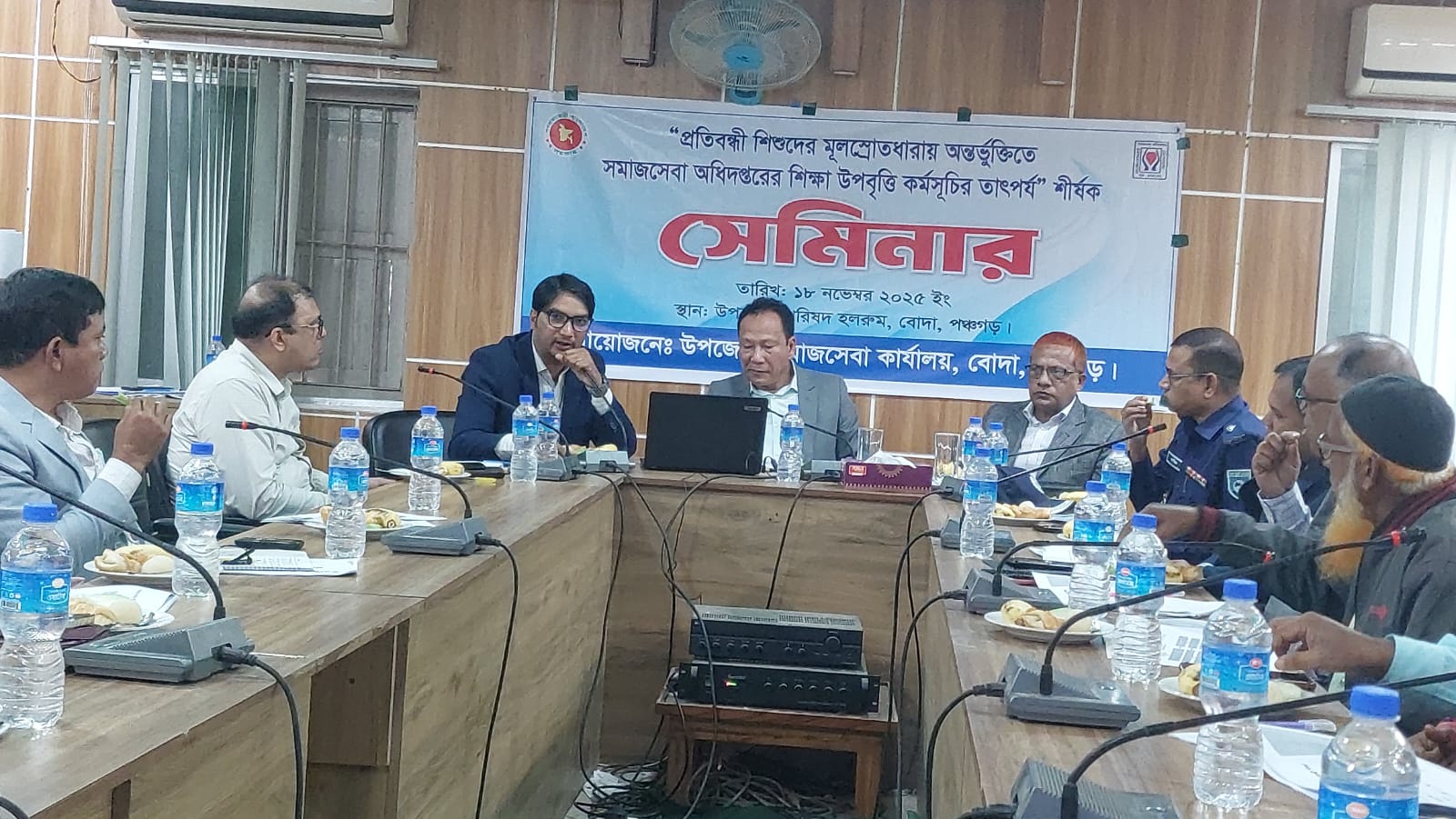 পঞ্চগড় প্রতিনিধি: পঞ্চগড় জেলার বোদা উপজেলার প্রতিবন্ধী শিশুদের মূলস্রোতধারায় অন্তর্ভুক্তিতে সমাজসেবা অধিদপ্তরের শিক্ষা উপবৃত্তি কর্মসূচির তাৎপর্য শীর্ষক সেমিনার অনুষ্ঠিত হয়েছে। মঙ্গলবার (১৮ নভেম্বর) সকালে উপজেলা পরিষদ হলরুমে সভাকক্ষে সমাজসেবা কার্যালয়ের উদ্যোগে সেমিনারটি আয়োজন করা হয়। সেমিনারে মূল প্রবন্ধ উপস্থাপন করেন সমাজসেবা পঞ্চগড় জেলা সমাজসেবা কার্যালয়ের উপ পরিচালক অনিরুদ্ধ কুমার রায়। সমাজসেবা কর্মকর্তা তৌকির আহমেদ এর সভাপতিত্বে এসময় অন্যান্যদের মধ্যে বক্তব্য রাখেন বোদা থানা ভারপ্রাপ্ত কর্মকর্তা আজিম উদ্দিন, সহকারী পরিচালক পঞ্চগড় জেলা সমাজসেবা কাযালয় মোঃ গোলাম ফারুক ,উপজেলা স্বাস্থ্য ও পঃপঃ কর্মকর্তা লুৎফুল কবির, উপজেলা মাধ্যমিক শিক্ষা অফিসার আইবুল ইসলাম, বোদা রিপোর্টার্স ক্লাব এর সাধারণ সম্পাদক মাহমুদুল হাসান বাবু প্রমুখ। ।
