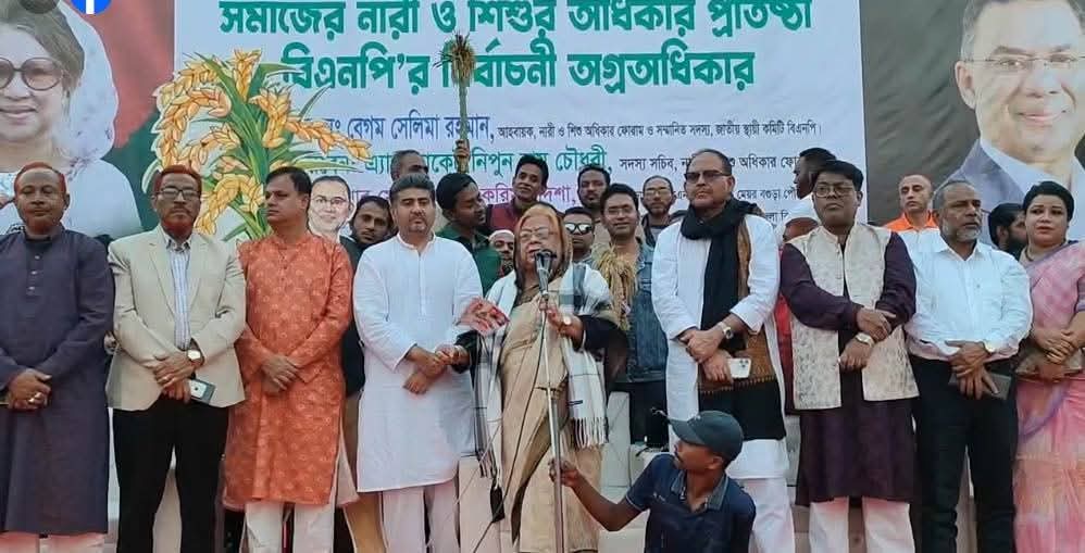 বাদশা আলম ‎শেরপুর (বগুড়া) প্রতিনিধি : ‎স্বাধীনতার পর থেকে দেশের প্রতিটি আন্দোলন-সংগ্রামে নারীরা অধিকার আদায়ের লড়াই করে এসেছেন উল্লেখ করে বিএনপির স্থায়ী কমিটির সদস্য ও নারী ও শিশু অধিকার ফোরামের আহ্বায়ক বেগম সেলিমা রহমান বলেন, “আপনারাই সেই নারী, সেই মা-বোন—যাদের ভোটে নির্বাচিত হয়ে গণতন্ত্রের মা, আমাদের ডেমোক্রেটিক নেত্রী বেগম খালেদা জিয়া প্রথম নারী প্রধানমন্ত্রী হয়েছিলেন।
