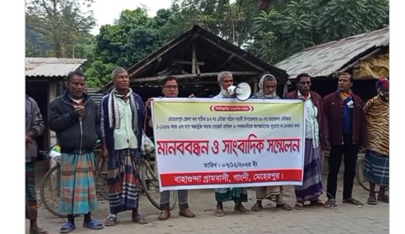 মানববন্ধনে লিখিত বক্তব্যে গ্রামবাসীর পক্ষে রাশেদুল ইসলাম বলেন আমরা মেহেরপুর জেলার গাংনী উপজেলা ধানখোলা ইউনিয়নের বাহাগুন্দা গ্রামের অধিবাসীবৃন্দ। এই গ্রাম টি ব্রিটিশ আমল হতে ছোট একটি মৌজায় গঠিত হয়েছে। কিন্তু গ্রামের মধ্যে নোয়াখালী পাড়া (ইসলামনগর) গ্রামের কিছু লোক নোয়াখালী জেলা হতে উঠে এসে বসবাস করে। বর্তমানে ইসলামনগর পাড়া বলে গ্রামটি পরিচিতি লাভ করেছে। ,আমরা জানতে পেরেছে, গোপনে ৫০ নং বাহাগুন্দা মৌজায় ১ নম্বর ম্যাপ হতে ১ হতে ১২৫৬ নং পর্যন্ত কর্তন করে নতুন মৌজার সাথে সংযুক্ত করে।আমাদেও গ্রামের বেশীরভাগ লোকজন নিরক্ষর ও কৃষক। কিন্তু জানার আগেই গোপনে নতুন মৌজা সৃষ্টিতে যাবতীয় কাজকর্ম প্রায় সম্পূর্ন করে। গ্রামের রৈাকজন জানতে পারে যে, আমাদেও গ্রামের বেশকিছু বাড়ির জমি, প্রাইমারী স্কুলের জমি ও আমাদেও মাঠের জমি এই মৌজার ভিতর অন্তর্ভূক্ত হয়েছে।আমরা গ্রামের সবাই মিলে আপনার ( জেলা প্রশাসক) বরাবর আবেদন করি। এবং হাইকোর্টে রিট পিটিশন দায়ের করি। এর প্রেক্ষিতে আপনার দপ্তর হতে নতুন কওে গণশুনানী শুরু করে। কিন্তু আমরা জানতে পারিনি যে. কোথায় গণশুনানী হচ্ছে। আমরা পরস্পর লোক মারফতে জানতে পারলাম যে, ইসলামনগর দাখিল মাদ্রাসায় মেহেরপুর সদর ও গাংনী উপজেলা নির্বাহী অফিসার গণশুনানী কওে আমাদেও সাথে কোন আলাপ আলোচনা করে নাই। আমাদের সদস্যা সমাধান করতে জেলা প্রশাসক মহোদয়ের সদয় দৃষ্টি কামনা করছি। তিনি আরও বলেন, নবগঠিত ৯৭ নং ইসলামনগর মৌজায় আমাদের ৫০ নং বাহাগুন্দা মৌজায় জমি সংযুক্ত না হয় সেই ব্যবস্থা করতে সদয় দৃষ্টি কামনা করা হয়েছে।