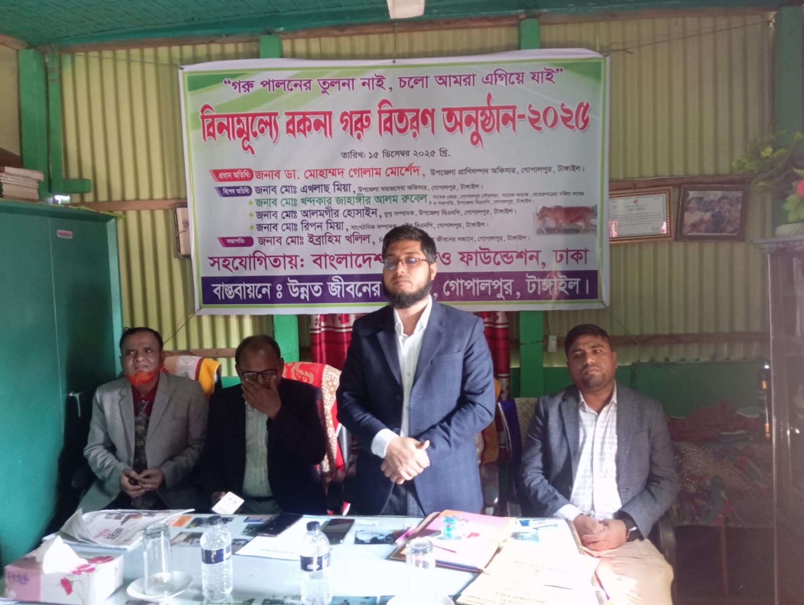 সোমবার (১৫ ডিসেম্বর) বেলা ১১টায় গোপালপুর পৌর শহরের মধুপুর ভট্ট কার্যালয়ে এ উপলক্ষে সংক্ষিপ্ত আলোচনা সভা ও গরু বিতরণ অনুষ্ঠান অনুষ্ঠিত হয়। বিতরণকৃত গরুগুলোকে উপজেলা প্রাণিসম্পদ দপ্তরের পক্ষ থেকে বিনামূল্যে ল্যাম্পি স্কিন ডিজিজের টিকাও প্রদান করা হয়।