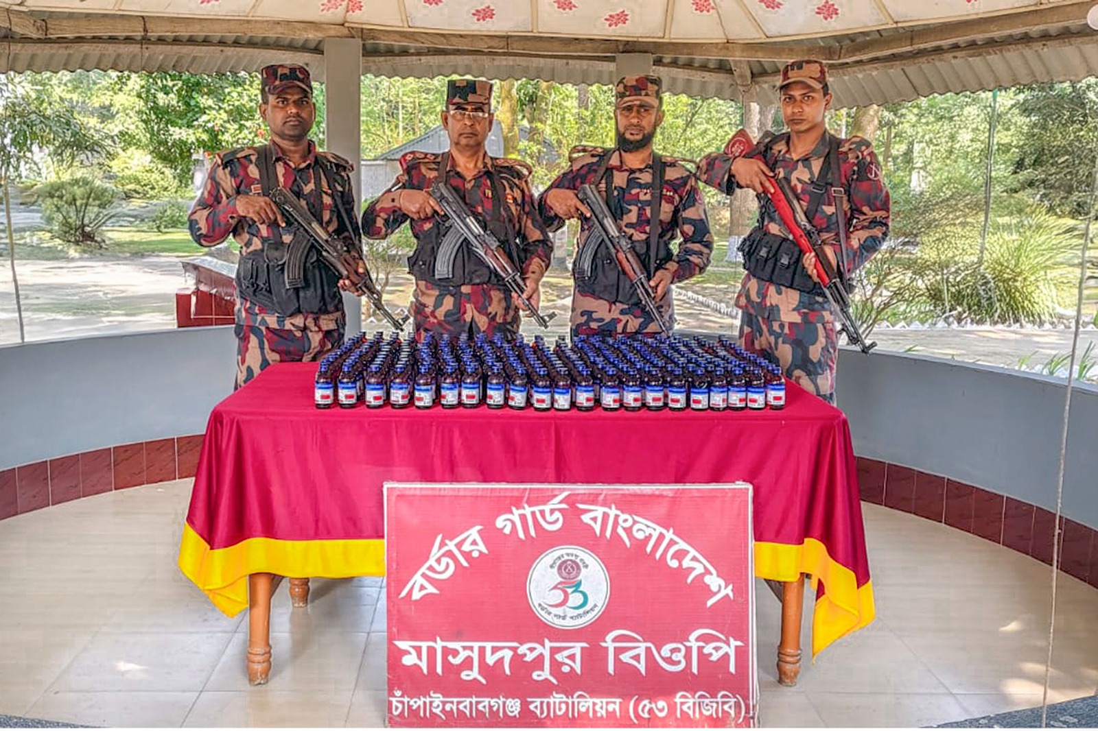 মাহিদুল ইসলাম ফরহাদ চাঁপাইনবাবগঞ্জ জেলা প্রতিনিধি:চাঁপাইনবাবগঞ্জে বিজিবির গোপন সূত্রের ভিত্তিতে (১৮ ডিসেম্বর) সকাল ৫ টা থেকে প্রায় ৬ ঘন্টা যাবৎ চাঁপাইনবাবগঞ্জ ব্যাটালিয়ন (৫৩ বিজিবি) এর বিশেষ টহলদল পৃথক পৃথক ০২টি অভিযান চালিয়ে ভারতীয় নেশাজাতীয় সিরাপ জব্দ করে। চাঁপাইনবাবগঞ্জ ব্যাটালিয়ান ৫৩ বিজিবি’র অধীনস্থ মাসুদপুর বিওপির ০১টি বিশেষ টহল শিবগঞ্জ থানাধীন মনাকষা ইউনিয়নের ঠুঠাপাড়া গ্রামে অভিযান চালিয়ে ২৭৮ বোতল ভারতীয় নেশাজাতীয় চকোপ্লাস সিরাপ জব্দ করে এবং মনাকষা বিওপি’র ০১টি বিশেষ টহল শিবগঞ্জ থানাধীন মনাকষা ইউনিয়েনের পারচৌকা গ্রামে অভিযান চালিয়ে ভারতীয় ১৫৯ বোতল নেশাজাতীয় এস্কাফ সিরাপ জব্দ করে, যার মোট বাজার মূল্য আনুমানিক ০২ লক্ষ টাকা। জব্দকৃত নেশাজাতীয় সিরাপ শিবগঞ্জ থানায় জমা করা হয়েছে। এই বিষয়ে চাঁপাইনবাবগঞ্জ ব্যাটালিয়ন (৫৩ বিজিবি) এর অধিনায়ক লেফটেন্যান্ট কর্নেল কাজী মুস্তাফিজুর রহমান, পিএসসি এ বিষয়ের সত্যতা নিশ্চিত করে বলেন, ব্যাটালিয়নের দায়িত্বপূর্ণ এলাকায় সীমান্ত সুরক্ষা সহ যেকোনো ধরনের অবৈধ কার্যক্রম রোধে বিজিবি সবসময় তৎপর রয়েছে।