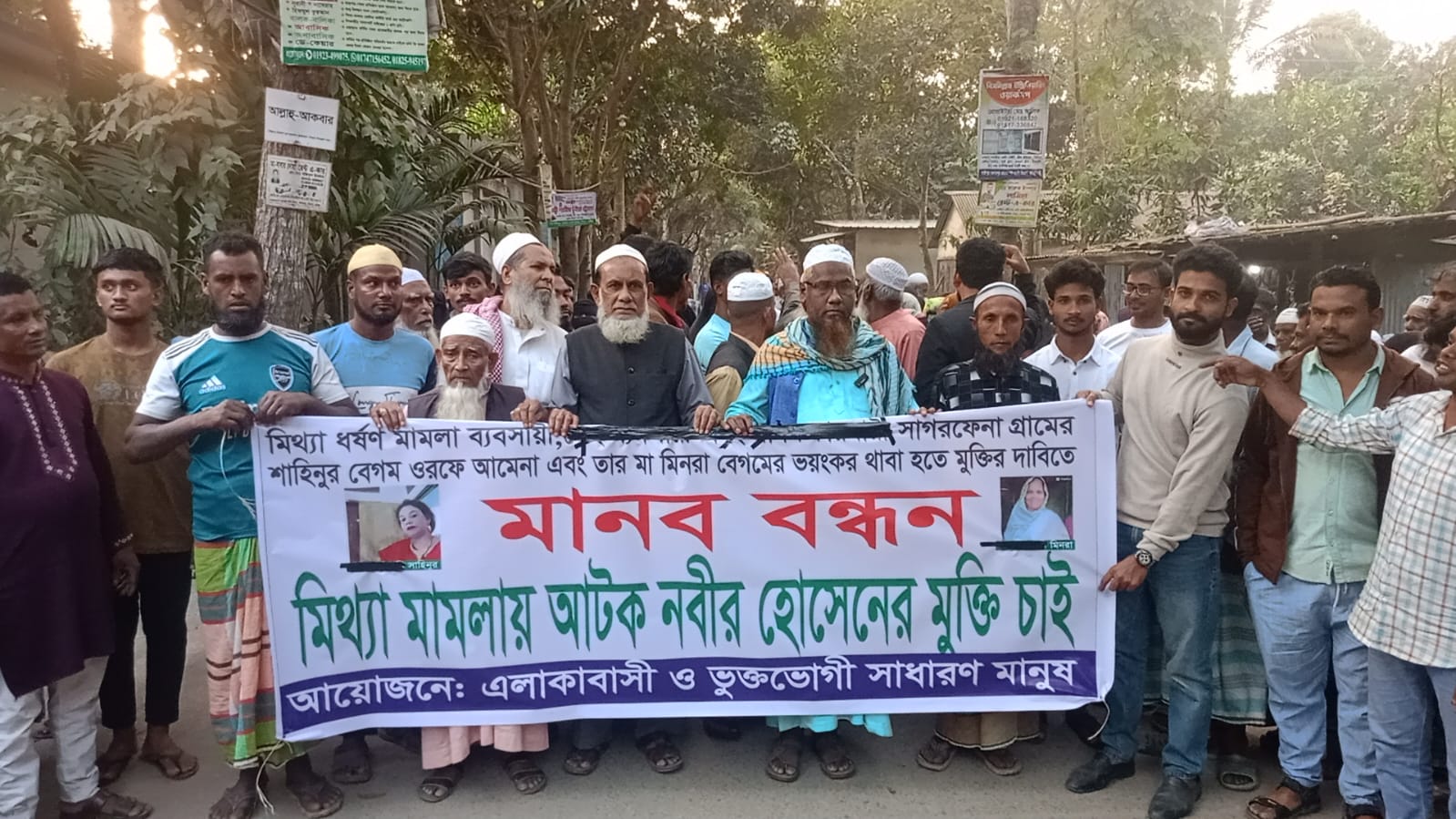 এলাকাবাসী ও ভুক্তভোগী সাধারণ মানুষের ব্যানারে গতকাল শুক্রবার বিকেলে উপজেলার জগতপুর ইউনিয়নের সাগরফেনা গ্রামের মধ্যে পাড়ায় মিথ্যা মামলায় আটক নবীর হোসেনের মুক্তির দাবিতে এই মানববন্ধন কর্মসূচি অনুষ্ঠিত হয়।