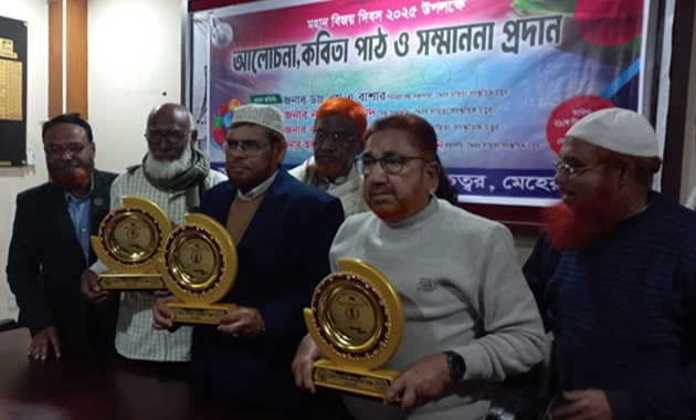 আমিরুল ইসলাম অল্ডাম মেহেরপুর প্রতিনিধি:  মহান বিজয় দিবস উপলক্ষে মেহেরপুর জেলার অন্যতম সাহিত্য ও সাংস্কৃতিক সংগঠন ভৈরব সাহিত্য সাংস্কৃতিক চত্বরএর আয়োজনে আলোচনা সভা, কবিতা পাঠ ও সম্মাননা স্মারক প্রদান অনুষ্ঠান অনুষ্ঠিত হয়েছে।