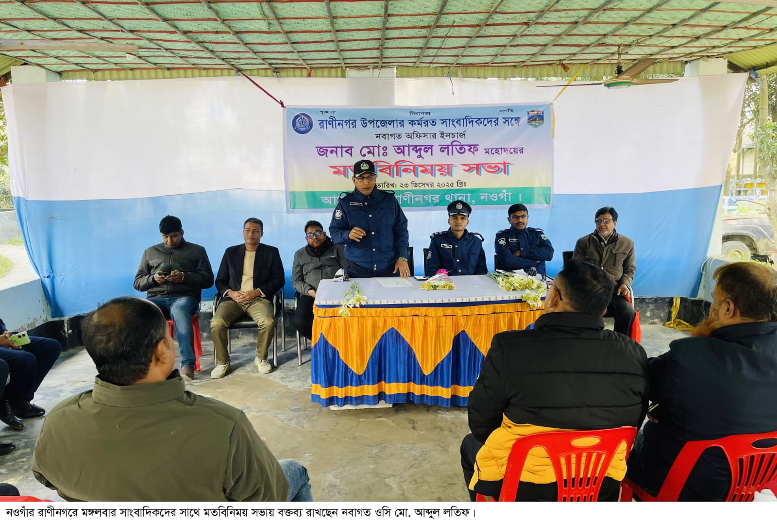মতবিনিময় সভায় রাণীনগর থানার নবাগত ওসি মো. আব্দুল লতিফ বলেন, সাংবাদিকরা সমাজের দর্পণ। তারা তথ্যের ভান্ডার, তাই তাদের কাছ থেকে প্রাপ্ত তথ্য আইনশৃঙ্খলা পরিস্থিতি নিয়ন্ত্রণে সহায়তা করে। সঠিক তথ্য প্রদানের মাধ্যমে গুজব ও অপপ্রচার প্রতিরোধে সাংবাদিকদের ভূমিকা গুরুত্বপূর্ণ। রাণীনগর উপজেলার শান্তিপূর্ণ পরিবেশ রক্ষায় সঠিক তথ্য সরবরাহে সাংবাদিকদের কাছে সহযোগিতা চান এবং একযোগে কাজ করার প্রত্যয় ব্যক্ত করেন।
