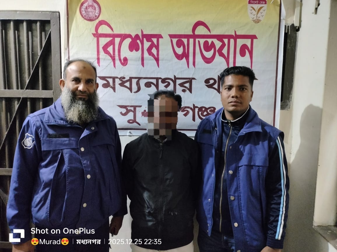 মধ্যনগর থানার মামলা নং-০৬ তাং-২৭/১১/২০২৪খ্রিঃ ধারা-15(3)/25D The Special Powers Act,1974 এর সন্দিগ্ধ আসামী-১। মোঃ সাখাওয়াত হোসাইন (৩৯), পিতা- মৃত আব্দুল হেকিম ,সাং-বনগাঁও, ৪নং মধ্যনগর সদর ইউনিয়ন, সাংগঠনিক সম্পাদক মধ্যনগর উপজেলা যুবলীগকে গ্রেফতার করে অদ্য ইং-২৫/১২/২০২৫ খ্রি: রাত ১০.৫০ ঘটিকায় মধ্যনগর থানায় আনা হয়।