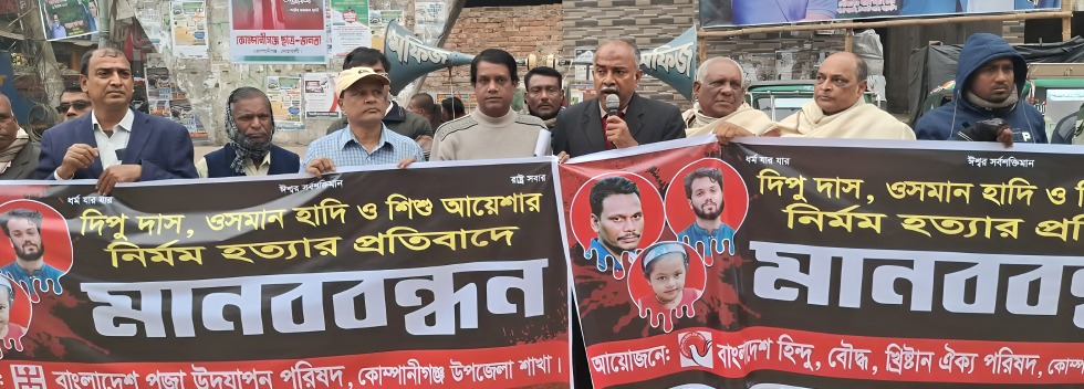 রমজান আলী রানা, কোম্পানীগঞ্জ (নোয়াখালী) প্রতিনিধি:নোয়াখালীর কোম্পানীগঞ্জ উপজেলায় দিপু দাস, শরীফ ওসমান হাদি এবং শিশু আয়েশার নির্মম হত্যাকাণ্ডের প্রতিবাদে মানববন্ধন অনুষ্ঠিত হয়েছে। শনিবার সকাল ১১টায় বসুরহাট জিরো পয়েন্টে এই মানববন্ধনের আয়োজন করা হয়।