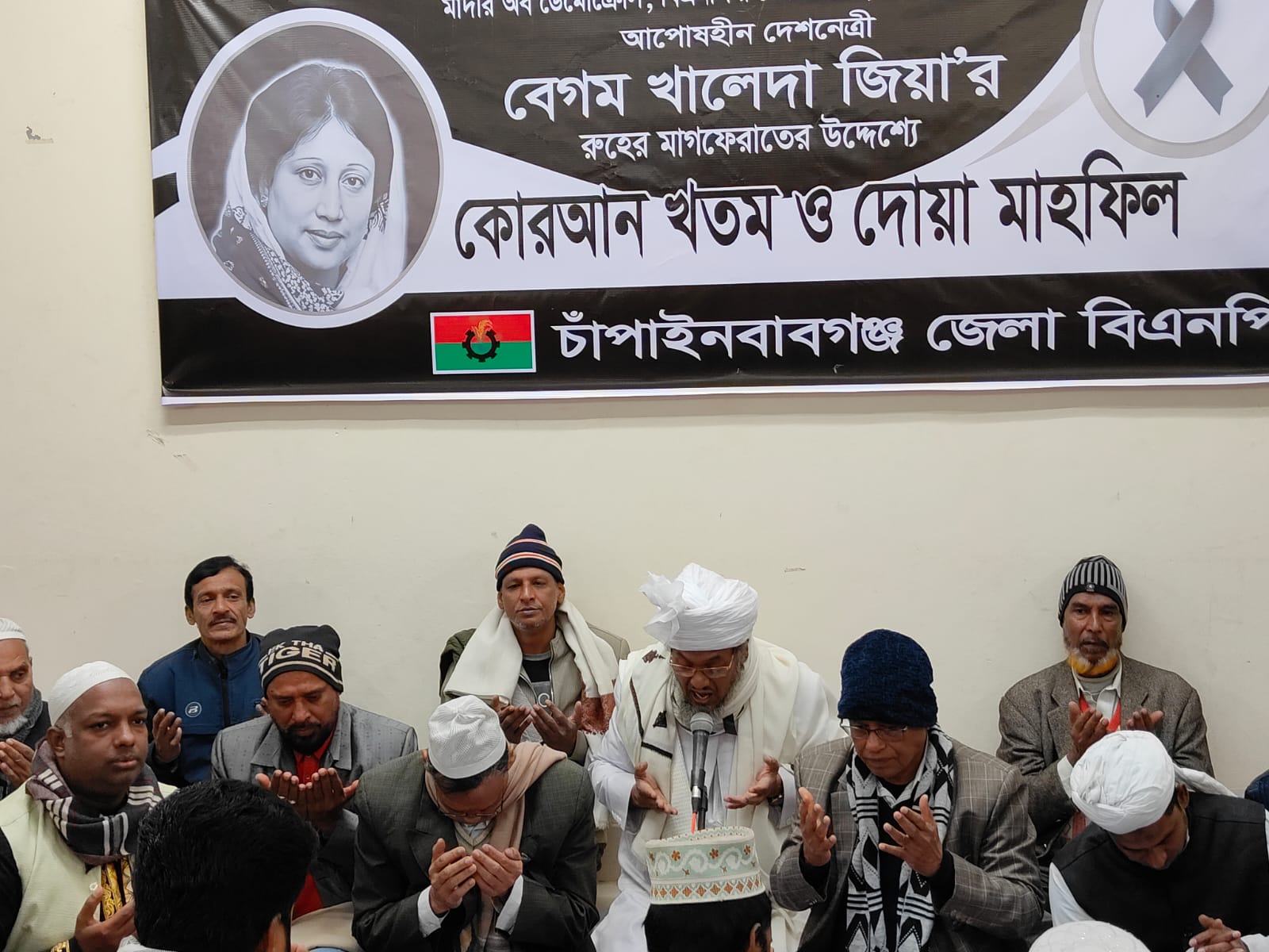 মাহিদুল ইসলাম ফরহাদ চাঁপাইনবাবগঞ্জ জেলা প্রতিনিধি: চাঁপাইনবাবগঞ্জ জেলা বিএনপির আয়োজনে বিএনপির চেয়ারপার্সন বেগম খালেদা জিয়ার রুহের মাগফেরাত কামনায় কোরআন খতম ও দোয়া মাহফিল অনুষ্ঠিত হয়েছে। বুধবার (৩১ ডিসেম্বর) বিকাল ৪টায় শহরের টাউনক্লাবের হলরুমে এ অনুষ্ঠান আয়োজন করা হয়। উক্ত অনুষ্ঠানে উপস্থিত ছিলেন চাঁপাইনবাবগঞ্জ জেলা বিএনপির আহবায়ক গোলাম জাকারিয়া, সিনিয়র যুগ্ম আহবায়ক এ্যাডভোকেট রফিকুল ইসলাম টিপু, পৌর বিএনপির সাধারণ সম্পাদক এএইচএমএম জামাল বাচ্চু,সদর থানা বিএনপির আহবায়ক মোঃ আমিনুল ইসলাম সহ জেলা বিএনপির সর্বস্তরের নেতাকর্মী উপস্থিত ছিলেন। বক্তারা বলেন, বেগম খালেদা জিয়া দেশের গণতান্ত্রিক অগ্রযাত্রায় গুরুত্বপূর্ণ ভূমিকা রেখেছেন। তাঁর রুহের মাগফেরাত কামনা করে এবং আল্লাহর দরবারে তাঁর জন্য জান্নাত কামনা করে। দলমত নির্বিশেষে সবাইকে ঐক্যবদ্ধ হয়ে দলকে সংগঠিত ও শক্তিশালী করার আহ্বান জানানো হয়েছে। ব্যক্তিগত মতভেদ ভুলে সবাই এক হয়ে কাজ করলে চাঁপাইনবাবগঞ্জের ৩টি আসনেই আসন্ন জাতীয় নির্বাচনে বিজয় নিশ্চিত করা সম্ভব হবে। জেলা বিএনপির আহবায়ক গোলাম জাকারিয়া বলেন, আমাদেরকে ভেদাভেদ ভুলে গেয়ে আগামী নির্বাচনে বিএনপিকে বিজয় নিশ্চিত করতে হবে। বিএনপির হাই কমান চাঁপাইনবাবগঞ্জ ৩ টি আসনে যাদেরকে নমিনেশন দিয়েছে। যারা নমিনেশন পেয়ে জেলা বিএনপির দায়িত্বে থাকা নেতাকর্মীদের যোগাযোগ করে না। আমাদের ছাড়ায় নির্বাচনে বিজয় নিশ্চিত করতে চাচ্ছে। তাই বলছি আপনারা ঐক্যবদ্ধ হয়ে নির্বাচন করতে হবে। এছাড়াও দায়িত্ব থাকা বিএনপির সকল নেতাকর্মী তাদের নিজ নিজ জায়গা থেকে তৃণমূল নেতাকর্মীরাকে ঐক্যবদ্ধ করলেই সংগঠনের গতিশীলতা বাড়বে এবং দল হবে সুসংগঠিত। এজন্য প্রত্যেক নেতা-কর্মীকে নিজ নিজ অবস্থান থেকে জনগণের পাশে দাঁড়ানোর আহ্বান জানায়।