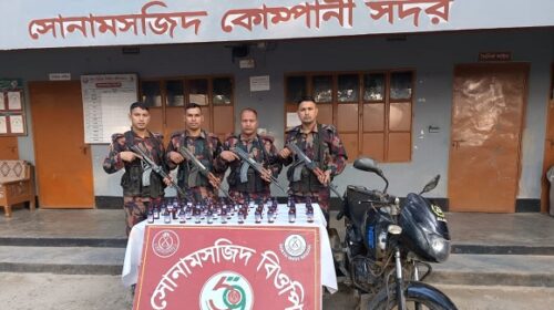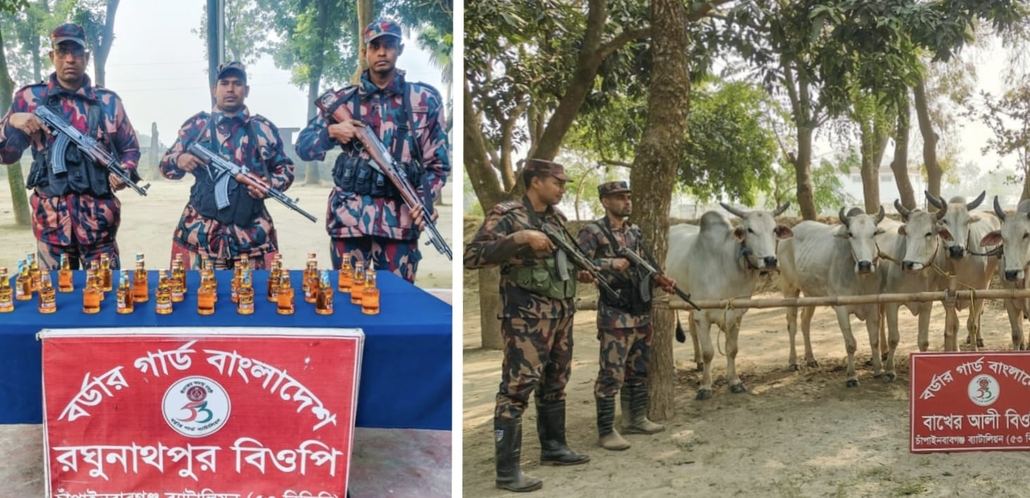 মাহিদুল ইসলাম ফরহাদ চাঁপাইনবাবগঞ্জ জেলা প্রতিনিধি: চাঁপাইনবাবগঞ্জ ব্যাটালিয়ন (৫৩ বিজিবি) গোপন তথ্যের ভিত্তিতে গতকাল ০২ জানুয়ারি সকাল ৫ ঘটিকা হতে প্রায় ৪ ঘন্টা পর্যন্ত ৫৩ বিজিবি এর বিশেষ টহলদল পৃথক পৃথক ০৫টি অভিযান পরিচালনা করে ভারতীয় ৬৬ বোতল মদ ও ১১টি গরু জব্দ করে। অভিযানসমূহে ৫৩ বিজিবির অধীনস্থ ফতেপুর বিওপি হতে টহল দল শিবগঞ্জ থানাধীন পাকা ইউনিয়নের শ্যামপুর গ্রাম থেকে ভারতীয় ৩৭ বোতল মদ ও রঘুনাথপুর বিওপি হতে শিবগঞ্জ থানাধীন দুর্লভপুর ইউনিয়নের কুকরিচর গ্রাম থেকে ২৯ বোতল মদ এবং মাসুদপুর বিওপি হতে শিবগঞ্জ থানাধীন মনাকষা ইউনিয়নের চৌধুরী স্মরণী গ্রাম থেকে ০৩টি গরু, মনাকষা বিওপি হতে শিবগঞ্জ থানাধীন মনাকষা ইউনিয়নের সেতারাপাড়া গ্রাম থেকে ০১টি গরু ও বাখেরআলী বিওপি হতে টহল দল’টি চাঁপাইনবাবগঞ্জ সদর থানাধীন নারায়নপুর ইউনিয়নের সোনাদিয়ারচর গ্রাম থেকে ০৭টি গরু জব্দ করে। জব্দকৃত ভারতীয় মদ ও গরুর আনুমানিক বাজার মূল্য ২৩ লক্ষ টাকা। জব্দকৃত মদ শিবগঞ্জ থানায় এবং গরু চাঁপাইনবাবগঞ্জ শুল্ক কার্যালয়ে জমা করা হয়েছে।