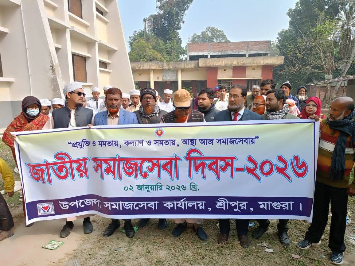 মোঃ সাইফুল্লাহ, মাগুরা প্রতিনিধি: “প্রযুক্তি ও মমতায়, কল্যাণ ও সমতায়, আস্থা আজ সমাজসেবায়” এই প্রতিপাদ্য নিয়ে শনিবার(৩ জানুয়ারি) সকালে শ্রীপুর উপজেলা সমাজসেবা কার্যালয়ের আয়োজনে জাতীয় সমাজসেবা দিবস পালিত হয়েছে। দিবসটি উপলক্ষে সমাজসেবা কার্যালয়ের উদ্যোগে শ্রীপুর উপজেলা পরিষদ চত্বর থেকে একটি বর্ণাঢ্য র্যালি বের হয়ে প্রধান সড়ক প্রদক্ষিণ শেষে সমাজসেবা কার্যালয় প্রাঙ্গণে আলোচনা সভায় মিলিত হয়।