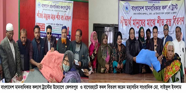 ঝিকরগাছা (যশোর) প্রতিনিধি : বাংলাদেশ মানবাধিকার কল্যাণ ট্রাস্টের উদ্যোগে অসহায়, দুস্থ, অবহেলিত, প্রতিবন্ধী ও বিধবাদের মাঝে কম্বল বিতরণ করা হয়েছে। শনিবার সকাল ১১টার সময় কেশবপুর প্রেসক্লাব হলরুমের অনুষ্ঠানে প্রধান অতিথি ছিলেন বাংলাদেশ মানবাধিকার কল্যাণ ট্রাস্টের মহাসচিব সাংবাদিক মো. সাইফুল ইসলাম। কেশবপুর প্রেসক্লাবের সভাপতি আশরাফ-উজ-জামান খানের সভাপতিত্বে ও সাধারণ সম্পাদক আব্দুল্লাহ আল ফুয়াদের সঞ্চালনায় বিশেষ অতিথি ছিলেন বাংলাদেশ মানবাধিকার কল্যাণ ট্রাস্টের কেন্দ্রেীয় কমিটির সাংগঠনিক সম্পাদক সুলতান আহমেদ, ঝিকরগাছা উপজেলা কমিটির সদস্য সিরাজুল ইসলাম সহ কেশবপুর প্রেসক্লাবের সাংবাদিকবৃন্দ। এছাড়াও শুক্রবার বেলা সাড়ে ৩টায় বাগেরহাটে বাংলাদেশ মানবাধিকার কল্যাণ ট্রাস্টের উদ্যোগে অসহায়, দুস্থ, অবহেলিত, প্রতিবন্ধী ও বিধবাদের মাঝে কম্বল বিতরণ বাংলাদেশ মানবাধিকার কল্যাণ ট্রাস্টের মহাসচিব সাংবাদিক মো. সাইফুল ইসলাম। বাংলাদেশ মানবাধিকার কল্যাণ ট্রাস্টের বাগেরহাট জেলার সভাপতি প্রফেসর শাহিদা আক্তারের সভাপতিত্বে ও সাধারণ সম্পাদক নার্গিস আক্তার ইভার সঞ্চালনায় বিশেষ অতিথি ছিলেন বাংলাদেশ মানবাধিকার কল্যাণ ট্রাস্টের কেন্দ্রেীয় কমিটির সাংগঠনিক সম্পাদক সুলতান আহমেদসহ আরও অনেকে।