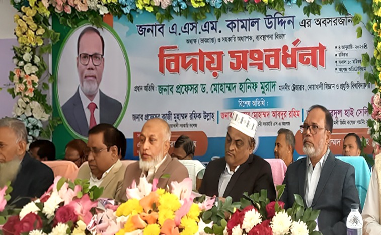রোববার (৪ জানুয়ারি) দুপুরে কলেজের অডিটোরিয়ামে আয়োজিত এ বিদায় সংবর্ধনা অনুষ্ঠানে প্রধান অতিথি হিসেবে উপস্থিত ছিলেন নোয়াখালী বিজ্ঞান ও প্রযুক্তি বিশ্ববিদ্যালয়ের ট্রেজারার প্রফেসর ড. মোহাম্মদ হানিফ মুরাদ।