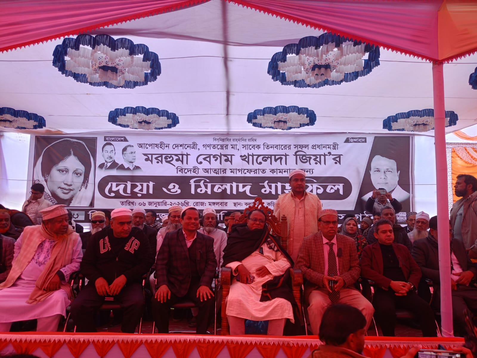 প্রধানমন্ত্রী দেশনেত্রী বেগম খালেদাজিয়ার রুহের মাগফেরাত কামনায় মিলাদ ও দোয়া মাহফিল অনুষ্ঠিত হয়েছে। তিতাস উপজেলা বিএনপি ও অঙ্গ সহযোগী সংগঠনের আয়োজনে পবিত্র কুরআন তেলোয়াত পাঠের মাধ্যমে গতকাল মঙ্গলবার সকাল দশটায় উপজেলার কড়িকান্দি ইউনিয়নের কলাকান্দি মেসার্স মৃত্তিকা এন্টার প্রাইজ সংলগ্ন বালুর মাঠে তিন বারের নির্বাচিত সাবেক প্রধানমন্ত্রী দেশনেত্রী বেগম খালেদাজিয়ার রুহের মাগফেরাত কামনায় মিলাদ ও দোয়া মাহফিল অনুষ্ঠিত হয়।মিলাদ ও দোয়া মাহফিল পূর্ব মুহূর্তে প্রধান অতিথির বক্তব্য রাখেন- কুমিল্লা-২(তিতাস-হোমনা) আসনে বিএনপির মনোনীত ধানের শীষের প্রার্থী অধ্যক্ষ সেলিম ভূইয়া, প্রধান বক্তা হিসেবে বক্তব্য রাখেন-কুমিল্লা উত্তর জেলা বিএনপির আহবায়ক আক্তারুজ্জামান সরকার।