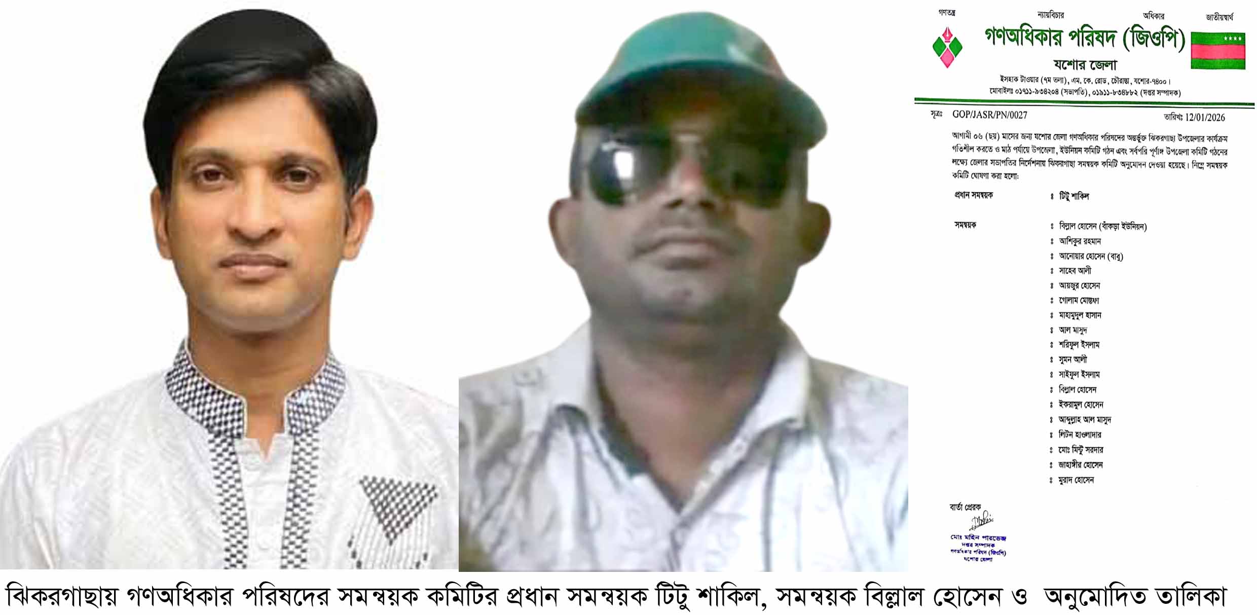 আফজাল হোসেন চাঁদ, ঝিকরগাছা : যশোরের ঝিকরগাছায় গণতন্ত্র, ন্যায়বিচার, অধিকার ও জাতীয়স্বার্থ এই স্লোগানকে সামনে রেখে গণঅধিকার পরিষদের সমন্বয়ক কমিটির অনুমোদন দিয়েছে জেলার সভাপতির নির্দেশনায় দপ্তর সম্পাদক মো. মহিন পারভেজ। সোমবার (১২ জানুয়ারী) রাতে তিনি যশোর জেলা গণঅধিকার পরিষদের অন্তর্ভুক্ত ঝিকরগাছা উপজেলার কার্যক্রম গতিশীল করতে ও মাঠ পর্যায়ে উপজেলা, ইউনিয়ন কমিটি গঠন এবং সর্বপরি পূর্ণাঙ্গ উপজেলা কমিটি গঠনের লক্ষ্যে ঝিকরগাছা সমন্বয়ক কমিটির প্রধান সমন্বয়ক করেছেন টিটু শাকিল। এছাড়াও উক্ত সমন্বয়ক কমিটিতে আছেন বিল্লাল হোসেন (বাঁকড়া ইউনিয়ন), আশিকুর রহমান, আনোয়ার হোসেন (বাবু), সাহেব আলী, আয়জুর হোসেন, গোলাম মোস্তফা, মাহামুদুল হাসান, আল মাসুদ, শরিফুল ইসলাম, সুমন আলী, সাইফুল ইসলাম, বিল্লাল হোসেন, ইকরামুল হোসেন, আব্দুল্লাহ আল মাসুদ, লিটন হাওলাদার, মোঃ মিন্টু সরদার, জাহাঙ্গীর হোসেন, মুরাদ হোসেন। এই প্রকাশিত কমিটি আগামী ০৬ (ছয়) মাসের জন্য অনুমোদন করেছেন জেলা কমিটি।