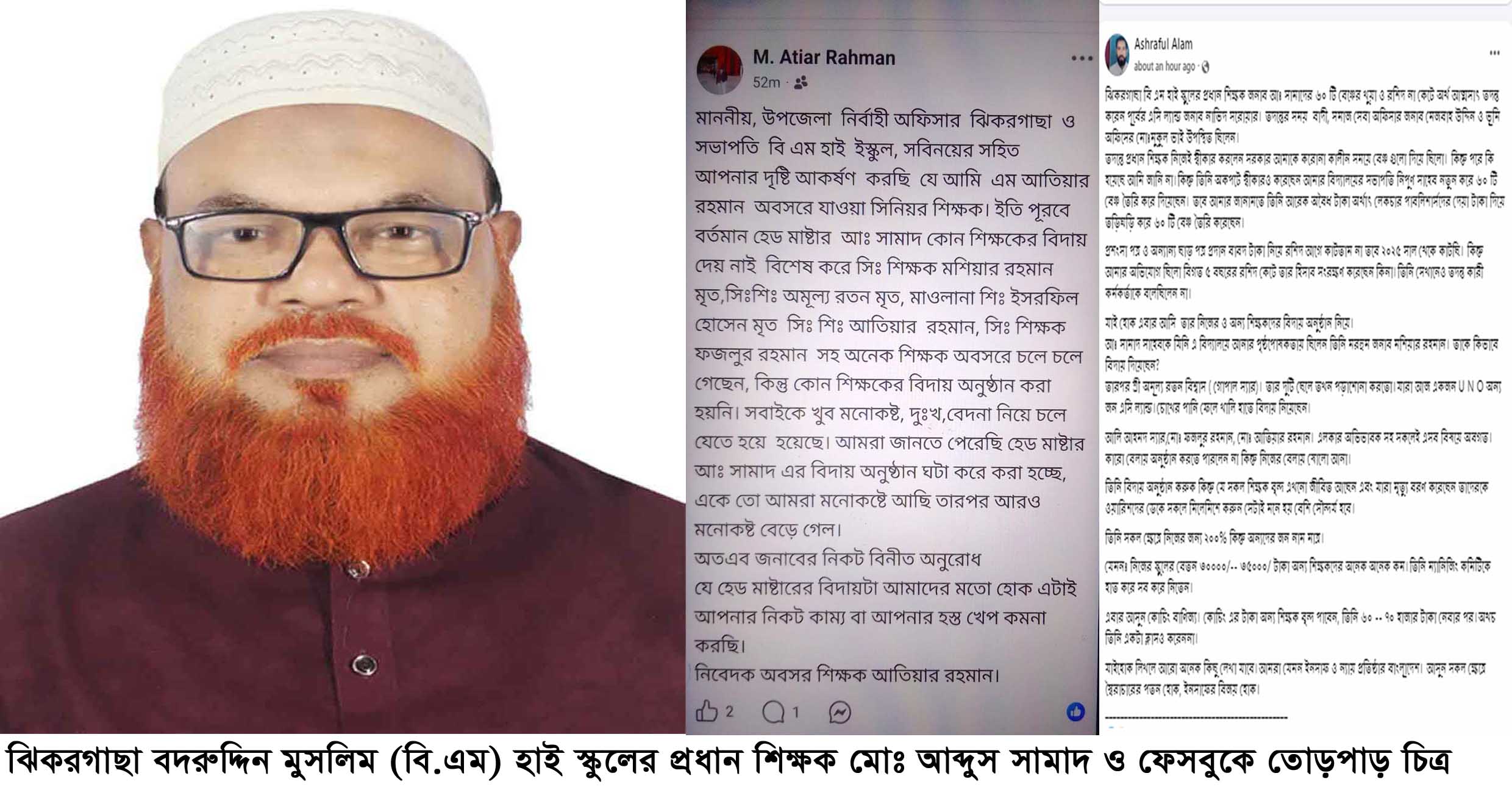 এছাড়াও প্রধান শিক্ষকে নিয়ে একই দিনে লাউজানী নিউ মডেল মাধ্যমিক বিদ্যালয়ের অবসরপ্রাপ্ত শিক্ষক আশরাফুল আলমের ফেসবুক পেজে তিনি লিখেছেন, ঝিকরগাছা বিএম হাই স্কুলের প্রধান শিক্ষক জনাব আঃ সামাদের ৬০ টি বেঞ্চের খুয়া ও রশিদ না কেটে অর্থ আত্মসাৎ তদন্ত করেন পূর্বের এসি ল্যান্ড জনাব নাভিদ সরোয়ার। তদন্তের সময় বাদী, সমাজ সেবা অফিসার জনাব মেজবাহ উদ্দিন ও ভূমি অফিসের মোঃমুকুল ভাই উপস্থিত ছিলেন। তদন্তে প্রধান শিক্ষক নিজেই স্বীকার করলেন সরকার আমাকে করোনা কালীন সময়ে বেঞ্চ গুলো দিয়ে ছিলো। কিন্তু পরে কি হয়েছে আমি জানি না।কিন্তু তিনি অকপটে স্বীকারও করেছেন আমার বিদ্যালয়ের সভাপতি নিপুণ সাহেব নতুন করে ৬০ টি বেঞ্চ তৈরি করে দিয়েছেন। তবে আমার জানামতে তিনি আরেক অবৈধ টাকা অর্থাৎ লেকচার পাবলিশার্সদের দেয়া টাকা দিয়ে তড়িঘড়ি করে ৬০ টি বেঞ্চ তৈরি করেছেন। প্রশংসা পত্র ও অন্যান্য ছাড় পত্র প্রদান বাবদ টাকা নিয়ে রশিদ আগে কাটতাম না তবে ২০২৫ সাল থেকে কাটছি। কিন্তু আমার অভিযোগ ছিলো বিগত ৫ বছরের রশিদ কেটে তার হিসাব সংরক্ষণ করেছেন কিনা। তিনি সেখানেও তদন্ত কারী কর্মকর্তাকে বলেছিলেন না। যাই হোক এবার আসি তার নিজের ও অন্য শিক্ষকদের বিদায় অনুষ্ঠান নিয়ে। আঃ সামাদ সাহেবকে যিনি এ বিদ্যালয়ে আনার পৃষ্ঠপোষকতায় ছিলেন তিনি মরহুম জনাব মশিয়ার রহমান। তাকে কিভাবে বিদায় দিয়েছেন? তারপর শ্রী অমূল্য রতন বিশ্বাস (গোপাল স্যার)। তার দুটি ছেলে তখন পড়াশোনা করতো। যারা আজ একজন ইউএনও অন্য জন এসিল্যান্ড। চোখের পানি ফেলে খালি হাতে বিদায় নিয়েছেন। আলি আহমদ স্যার, মোঃ ফজলুর রহমান, মোঃ আতিয়ার রহমান। এলকার অভিভাবক সহ সকলেই এসব বিষয়ে অবগত। কারো বেলায় অনুষ্ঠান করতে পারলেন না কিন্তু নিজের বেলায় ষোলো আনা। তিনি বিদায় অনুষ্ঠান করুক কিন্তু যে সকল শিক্ষক বৃন্দ এখনো জীবিত আছেন এবং যারা মৃত্যু বরণ করেছেন তাদেরকে ওয়ারিশদের ডেকে সকলে মিলেমিশে করুন সেটাই মনে হয় বেশি সৌন্দর্য হবে। তিনি সকল ক্ষেত্রে নিজের জন্য ২০০% কিন্তু অন্যদের জন নাম মাত্র। যেমনঃ নিজের স্কুলের বেতন ৩০০০০/- ৩৫০০০/ টাকা অন্য শিক্ষকদের অনেক অনেক কম। তিনি ম্যানিজিং কমিটিকে হাত করে সব করে নিতেন। এবার আসুন কোচিং বাণিজ্য। কোচিং এর টাকা অন্য শিক্ষক বৃন্দ পাবেন, তিনি ৬০-৭০ হাজার টাকা নেবার পর। অথচ তিনি একটা ক্লাসও করেননা। যাইহোক লিখলে আরো অনেক কিছু লেখা যাবে।আমরা যেমন ইনসাফ ও ন্যায় প্রতিষ্ঠার বাংলাূদেশ। আসুন সকল ক্ষেত্রে স্বৈরাচারের পতন হোক, ইনসাফের বিজয় হোক।