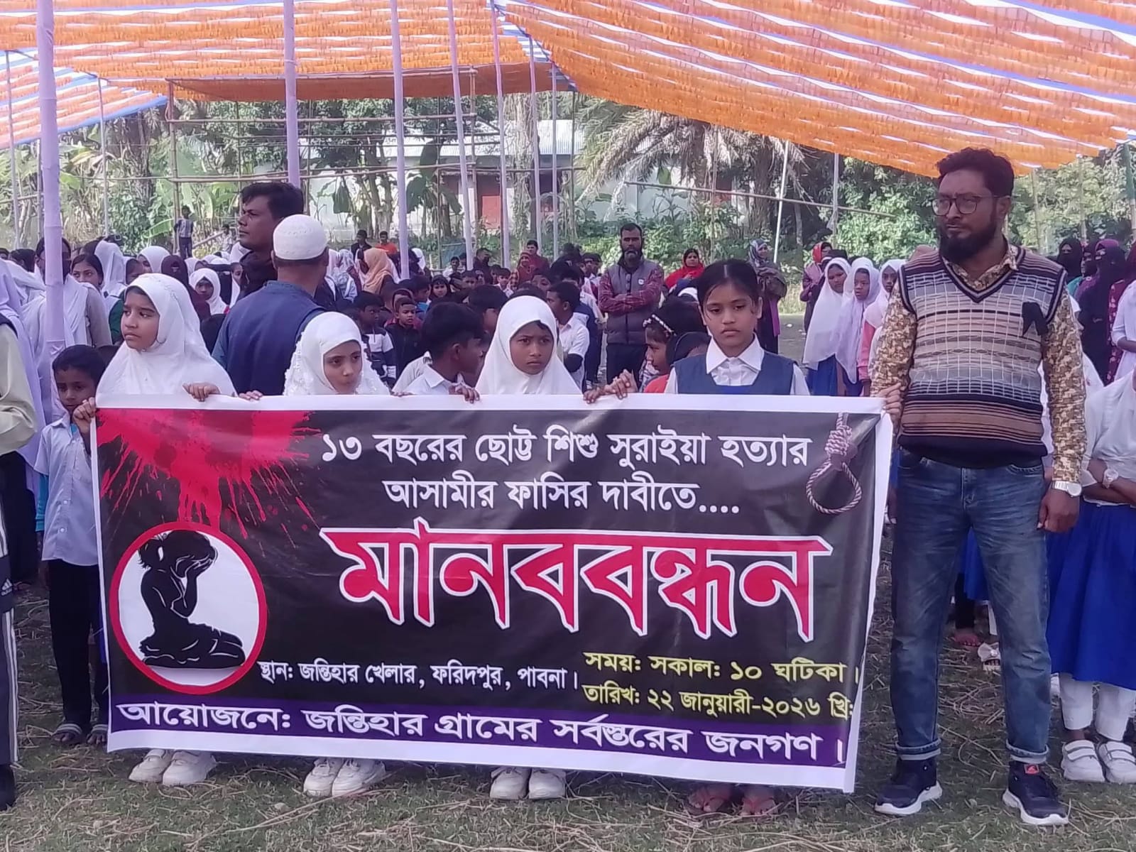 মো.মেহেদী হাসান,ভাঙ্গুড়া ,পাবনা উপজেলা প্রতিনিধি: পাবনার ফরিদপুর উপজেলায় অষ্টম শ্রেণির ছাত্রী মোছা. সুরাইয়া খাতুন (১৩) হত্যাকাণ্ডের প্রতিবাদ এবং দোষীদের দ্রুত গ্রেপ্তার ও দৃষ্টান্তমূলক শাস্তির দাবিতে বিক্ষোভ সমাবেশ ও মানববন্ধন অনুষ্ঠিত হয়েছে।