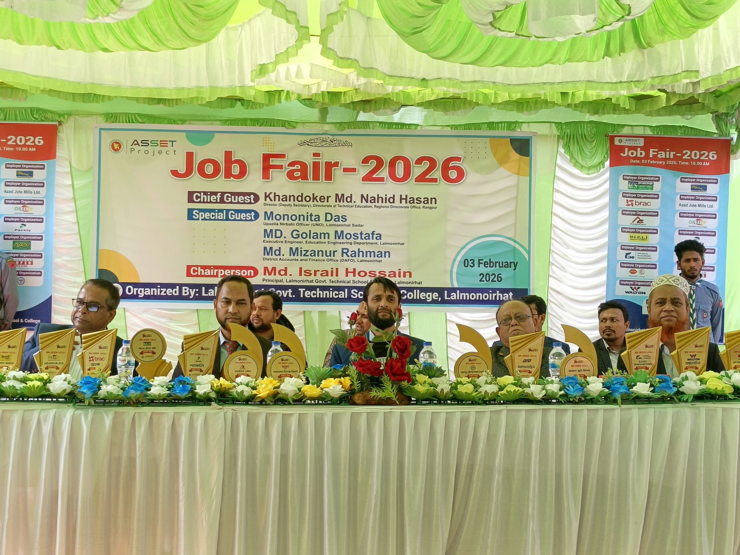 মিজানুর রহমান মিজান লালমনিরহাট প্রতিনিধিঃলালমনিরহাট টেকনিক্যাল স্কুল অ্যান্ড কলেজে অ্যাসেট প্রকল্পের আওতায় চাকুরি মেলা-২০২৬ অনুষ্ঠান অনুষ্ঠিত হয়েছে। অ্যাসেট প্রকল্পের আওতায় কম্পিটেন্ট প্রশিক্ষণার্থী, এসএসসি, এইচএসসি ভোকেশনাল পাশকৃত শিক্ষার্থী ও ডিপ্লোমা-ইন ইঞ্জিনিয়ারিং শিক্ষার্থীদের নিয়ে এ মেলার আয়োজন করা হয়।