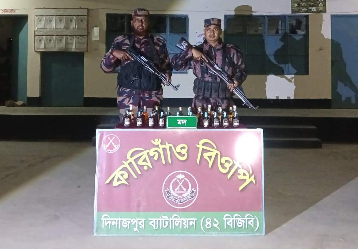 শুক্রবারে এক প্রেস বিজ্ঞপ্তিতে বিজিবি জানায়, গত বুধবার (৫ ফেব্রুয়ারি) সন্ধ্যা ৬টা ৪৫ মিনিটে দিনাজপুর ব্যাটালিয়ন (৪২ বিজিবি) এর অধীনস্থ কারিগাঁও বিওপির একটি টহল দল ঠাকুরগাঁও জেলার হরিপুর উপজেলার সীমান্ত পিলার ৩৫৪/৬-এস থেকে আনুমানিক ২৫০ গজ বাংলাদেশের অভ্যন্তরে একটি ভুট্টা ক্ষেতে তল্লাশি চালায়। এ সময় মালিকবিহীন অবস্থায় ৪০ বোতল ভারতীয় মদ উদ্ধার করা হয়।