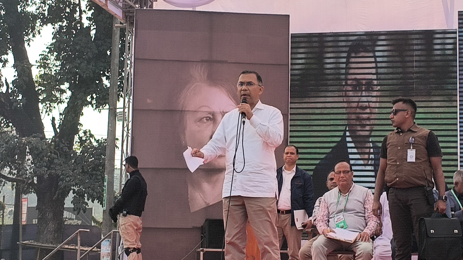 সমাবেশ মঞ্চে উপস্থিত বিএনপি মহাসচিব মির্জা ফখরুল ইসলাম আলমগীর বলেন, ধ্বংসস্তূপ থেকে দেশকে বাঁচাতে গোটা দেশ তারেক রহমানের দিকে তাকিয়ে। কঠিন সময়ে তারেক রহমান নেতৃত্ব দিচ্ছেন, তাকে শতভাগ সমর্থন দিতে হবে।