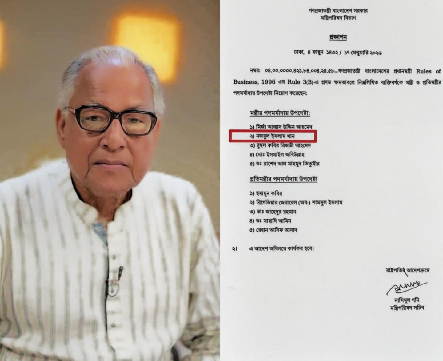 রোকনুজ্জামান সবুজ জামালপুরঃ দীর্ঘ জল্পনা–কল্পনার অবসান ঘটিয়ে মন্ত্রীর পদমর্যাদায় প্রধানমন্ত্রীর উপদেষ্টা হিসেবে নিয়োগ পেয়েছেন বিএনপির স্থায়ী কমিটির অন্যতম সদস্য ও নির্বাচন পরিচালনা কমিটির কো-চেয়ারম্যান,শ্রমিক নেতা নজরুল ইসলাম খান।