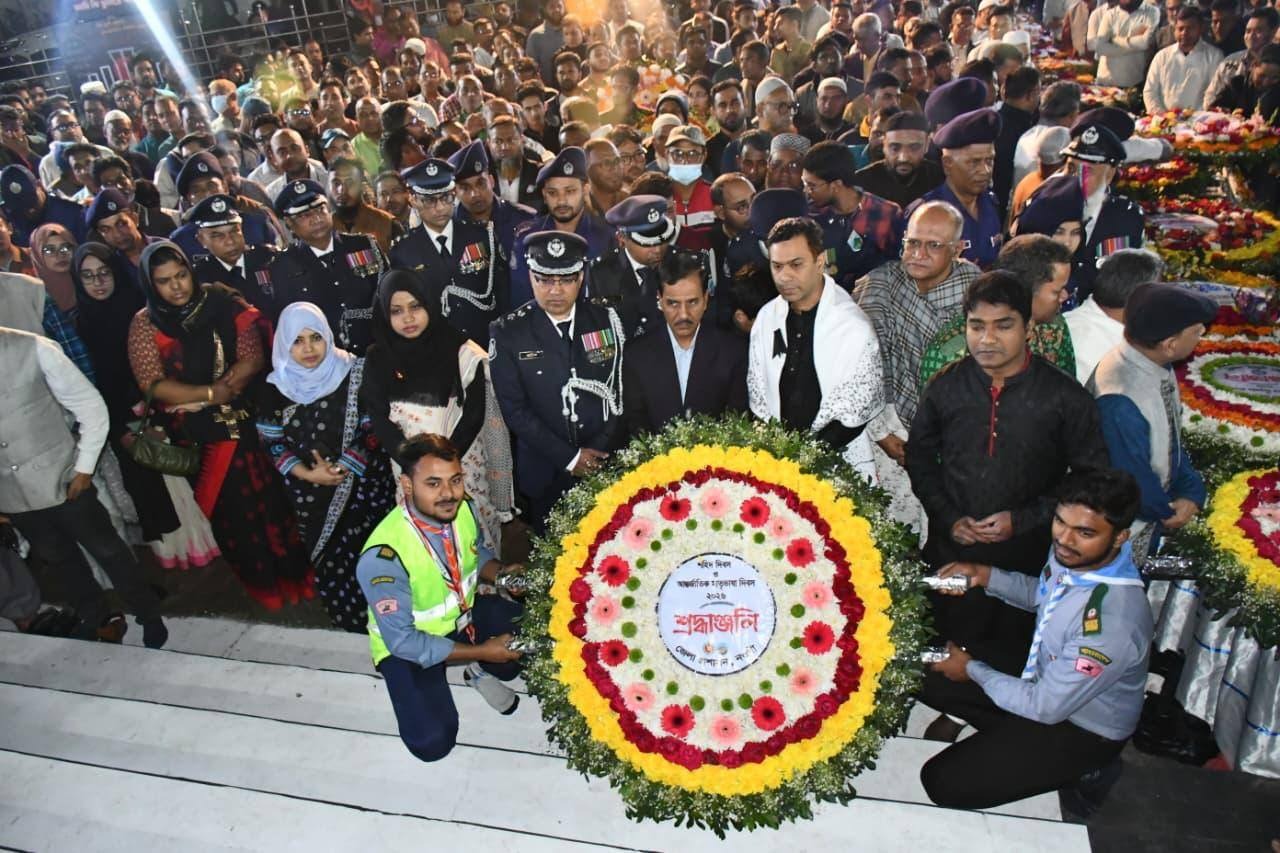 এ সময় ‘আমার ভাইয়ের রক্তে রাঙানো একুশে ফেব্রুয়ারি’ গানটি বাজতে থাকলে পুরো প্রাঙ্গণ জুড়ে নেমে আসে নীরবতা ও শোকের আবহ। অনেকেই খালি পায়ে শহীদ মিনারে এসে ফুল দিয়ে শ্রদ্ধা জানান। বিভিন্ন শিক্ষা প্রতিষ্ঠানের শিক্ষক-শিক্ষার্থীরাও দলবদ্ধভাবে উপস্থিত হয়ে ভাষা শহীদদের আত্মত্যাগ স্মরণ করেন।