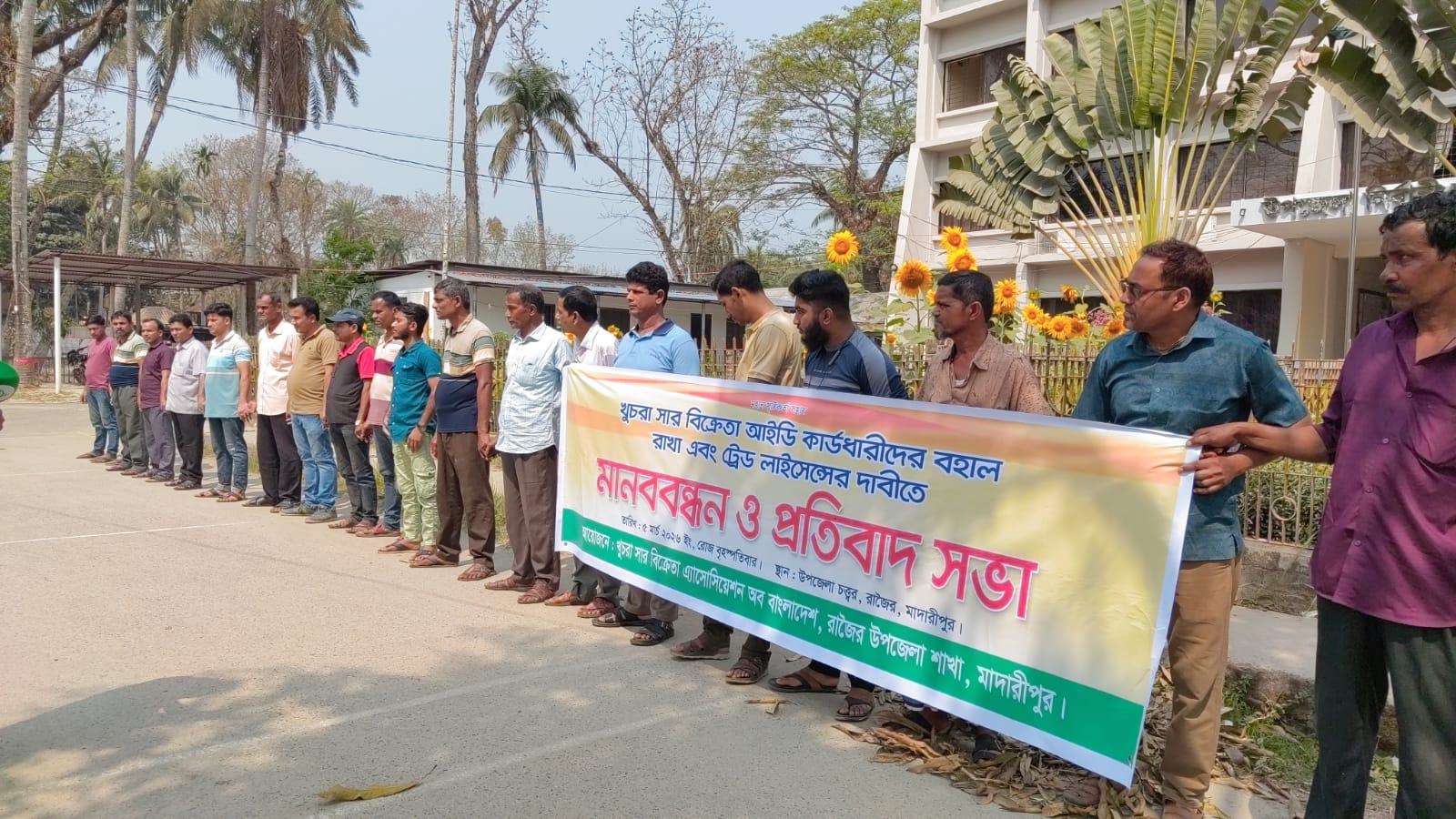 (৫ মার্চ বৃহস্পতিবার) সারে ১১টায় রাজৈর উপজেলা পরিষদ চত্বরে ইউএনও অফিসারের অফিসের সামনেই এই মানববন্ধন ও প্রতিবাদ সমাবেশ করেন এই সার বিক্রেতারা। এসময় তারা বিভিন্ন স্লোগান দিতে থাকেন ও তাদের এই লাইসেন্স বহালের দাবী জানান।