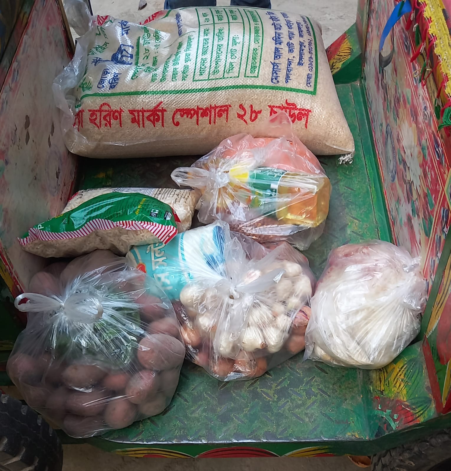 সহায়তা হিসেবে তিনি ২৫ কেজি চাল,২ কেজি ডাল,১ লিটার তেল,১ কেজি লবণ,১ কেজি বুট,১ কেজি রসুন,২ কেজি পেঁয়াজ,আধা কেজি মুড়ি,কাঁচামরিচ এবং একটি মুরগি প্রদান করেন।