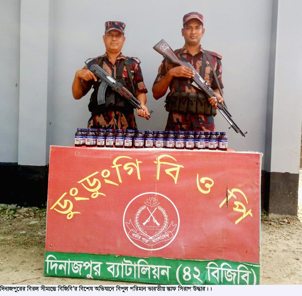 বিজিবি জানায়, শুক্রবার দিবাগত রাত আড়াইটার দিকে প্রাপ্ত সুনির্দিষ্ট গোয়েন্দা তথ্যের ভিত্তিতে দিনাজপুর ব্যাটালিয়ন (৪২ বিজিবি) এর অধীনস্থ উপজেলার ৮নং ধর্মপুর ইউপি’র ডুংডুংগী বিওপি’র একটি টহল দল চোরাচালান বিরোধী বিশেষ অভিযান পরিচালনা করে। অভিযানে সীমান্ত পিলার ৩২৪/৮-এস হতে আনুমানিক ১৫০ গজ বাংলাদেশের অভ্যন্তরে গোবিন্দপুর নামক স্থান হতে মালিকবিহীন অবস্থায় ৯৫ বোতল ভারতীয় স্কাফ সিরাপ উদ্ধার করা হয়। উদ্ধারকৃত মাদকদ্রব্যের সিজার মূল্য ৩৮,০০০/- (আটত্রিশ হাজার) টাকা।