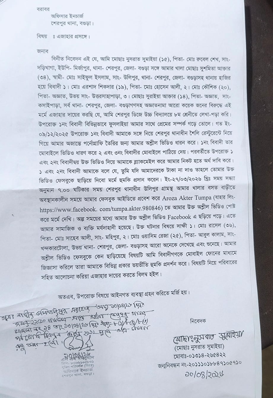 থানায় দায়ের করা এজাহার ও মামলা তদন্তকারী উপপরিদর্শক মো. আল আমিন বলেন, এই মামলার বাদি এককিশোরী (১৫)। শহরের একটি হাইস্কুলের অষ্টম শ্রেণীর ছাত্রী। একই স্কুলের এক ছাত্রের (১৬) প্রেমের সম্পর্কে গতবছর (২০২৫ সাল) ৯ ডিসেম্বর শহরের স্থানীয় একটি রেস্টুরেন্টে ওই ছাত্র নিয়ে যায়। সেখানেই মামলার এই বাদির অজান্তেই ওই কিশোর (মামলার এক নম্বর এজহারনামীয়) অশ্লীল ভিডিও ধারণ করে। পরে এই ভিডিও মামলার অপর দুই আসামির কাছে মুঠোফোনের মাধ্যমে পাঠিয়ে দেয়। পরবর্তীতে ১ এবং ২নং আসামি (২০) উক্ত ভিডিও দিয়ে কিশোরী বাদিকে ব্ল্যাকমেইল করে অর্থ দাবি করে। টাকা না দিলে এই অশ্লীল ভিডিও সামাজিক যোগাযোগ মাধ্যম ফেসবুকে ছড়িয়ে দেওয়ার হুমকি দেয়। মামলার আসামিরা এই টাকা না পাওয়ার কারণে গত ২৭ মার্চ মামলার বাদি একজনের ফেসবুকে এই অশ্লীল ভিডিও পোস্ট দেখতে পান। অল্প সময়ের মধ্যে এই অশ্লীল ভিডিওটি আরো ব্যাপকভাবে ছড়িয়ে পড়ে। এতে মামলার বাদী এই ছাত্রের সামাজিক ও ব্যক্তি মর্যাদাহানির ঘটনা ঘটে।