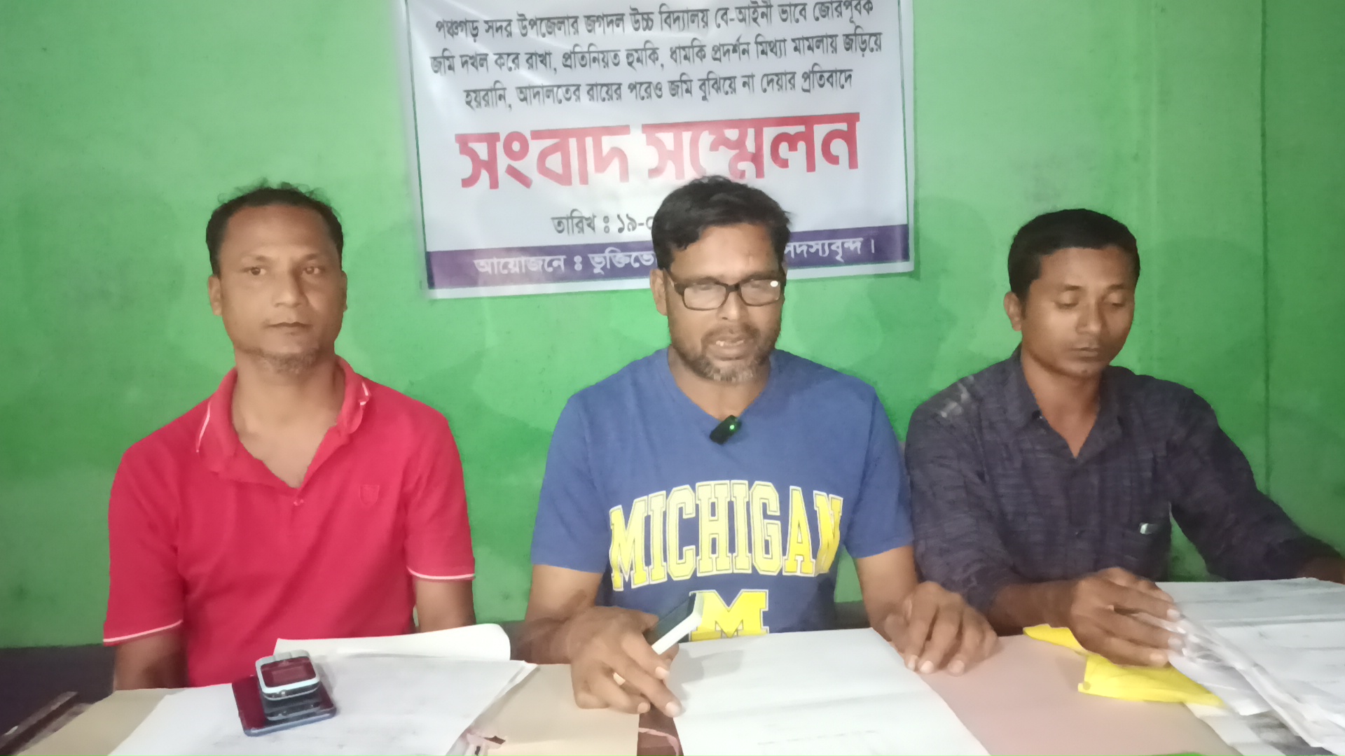বক্তারা জানান, ১৬টি দাগে ৭ একর ৮৭ শতক জমির মধ্যে ২ একর ৭ শতক জমি আমাদের অংশ আছে। এজমির মধ্যে ১ একর জমির মধ্যে স্কুল ৮০ শতক জমি জোরপূর্বক ভাবে দখল করে রেখেছে। বাকি জমির মধ্যে ২৪টি দোকান ঘর আমাদের দখলে রয়েছে। তারা রাজনৈতিক নেতৃবৃন্দের সাথে নিয়ে আমাদের ৮০ শতক জমি ও ২৪টি দোকানঘর দখল করার অপচেষ্টা চালিয়ে যাচ্ছে। আমরা জমির আদালতে রায় পাই। রায় পাওয়ার পরেও জগদল উচ্চ বিদ্যালয়ের প্রধান শিক্ষক আনিসুর রহমান, বিদ্যালয়ের সাবেক সভাপতি আব্দুল আলিম, জগদল বালিকা উচ্চ বিদ্যালয়ের সাবেক প্রধান শিক্ষক একরামুল হক, মকছেদ আলী ও মোকাজ্জল হোসেনসহ স্থানীয় স্বার্থন্বেষী মহলের সদস্যদের সহযোগিতায় তারা অনৈতিক সুবিধা নিয়ে আমাদের জমি দখল করার অপচেষ্টা চালিয়ে যাচ্ছে।
