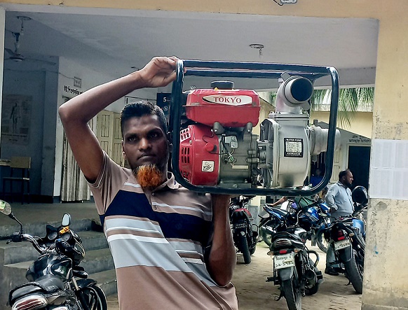 বিরলে জালানি তেল জন্য সেচযন্ত্র কাঁধে নিয়ে এবার ইউনিয়ন পরিষদে আসলেন এক লিচু বাগান মালিক।