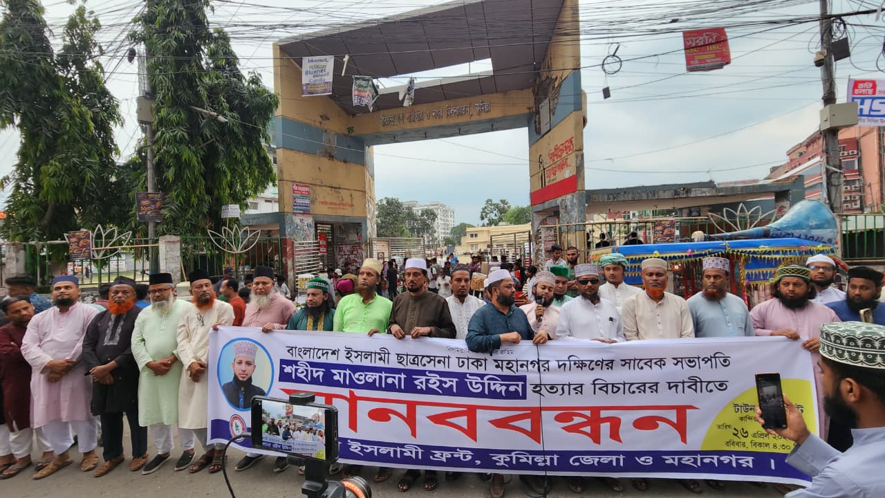 আলেম ও ইমাম শহীদ মাওঃ রইস উদ্দিন এর প্রথম শাহাদাৎ বার্ষিকী উপলক্ষে ও তাঁর হত্যাকাণ্ডের সাথে জড়িতদের গ্রেফতার ও বিচারের দাবীতে কুমিল্লায় মানববন্ধন অনুষ্ঠিত