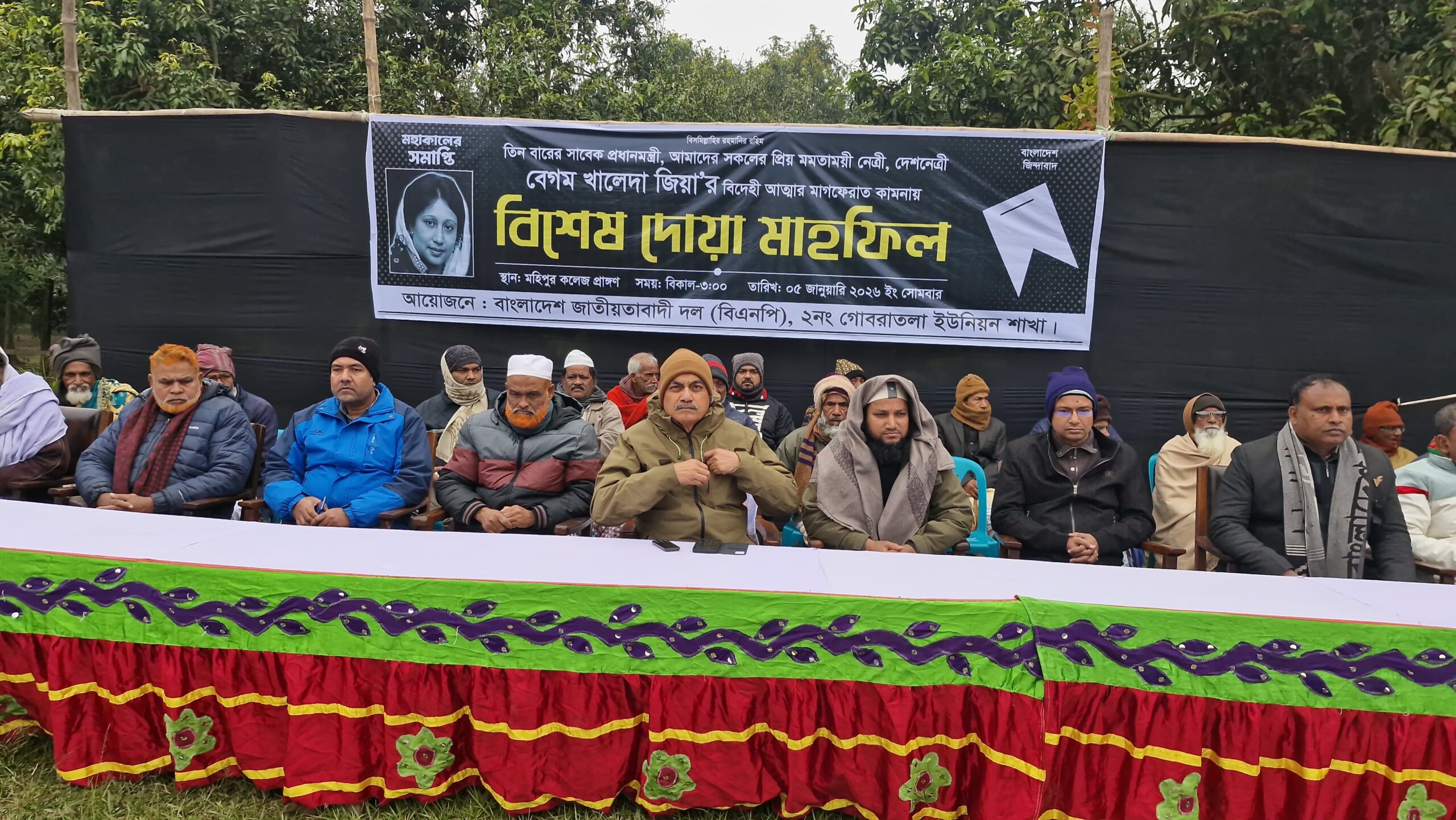 মাহিদুল ইসলাম ফরহাদ চাঁপাইনবাবগঞ্জ জেলা প্রতিনিধি: সাবেক প্রধানমন্ত্রী ও বিএনপি চেয়ারপার্সন বেগম খালেদা জিয়ার আত্নার মাগফেরাত কামনায় চাঁপাইনবাবগঞ্জে বিশেষ দোয়া মাহফিল অনুষ্ঠিত হয়েছে। সদর উপজেলার গোবরাতলা ইউনিয়ন বিএনপির আয়োজনে সোমবার (০৫ জানুয়ারী) বিকেলে মহিপুর কলেজ মাঠে এই দোয়া মাহফিল হয়।