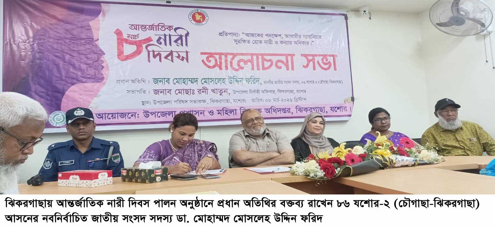 আফজাল হোসেন চাঁদ, ঝিকরগাছা (যশোর) : “আজকের পদক্ষেপ, আগামীর ন্যায়বিচার সুরক্ষিত হোক নারী ও কন্যার অধিকার” এই স্লোগানকে সামনে রেখে যশোরের ঝিকরগাছা উপজেলা প্রশাসন ও মহিলা বিষয়ক অধিদপ্তরের উদ্যোগে আন্তর্জাতিক নারী দিবস-২০২৬ পালন অনুষ্ঠানে প্রধান অতিথি ছিলেন, ৮৬ যশোর-২ (চৌগাছা-ঝিকরগাছা) আসনের নবনির্বাচিত জাতীয় সংসদ সদস্য ডা. মোহাম্মদ মোসলেহ উদ্দিন ফরিদ। তিনি তার বক্তব্যে বলেন, নারীর সম্মান, মর্যাদা, নিরাপত্তা ও অধিকার প্রতিষ্ঠায় সমাজের প্রতিটি মানুষকে সচেতন ও সোচ্চার হতে হবে দেশের উন্নয়ন ও সমৃদ্ধি অর্জনে নারী-পুরুষকে কাঁধে কাঁধ মিলিয়ে এগিয়ে আসতে হবে। নিজেদের অধিকার আদায়ে নারীদের আগে নিজ নিজ অবস্থান থেকে সচেতন ও আত্মপ্রত্যয়ী হতে হবে।